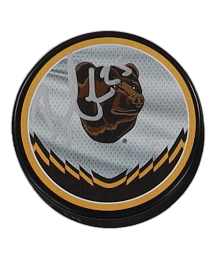 Boston Bruins logo hockey puck that has been hand-signed by Brandon Carlo.