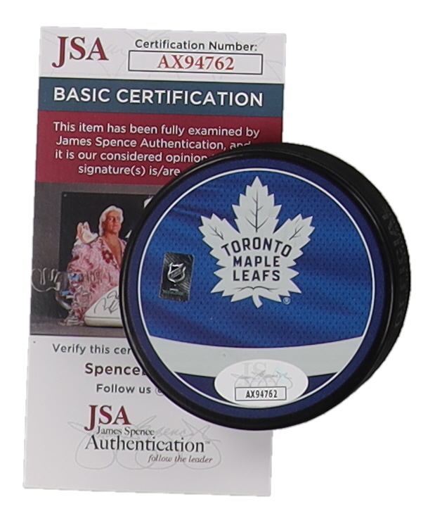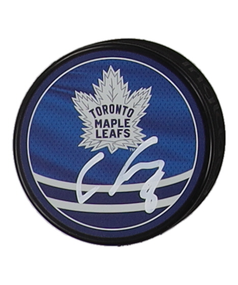 Toronto Maple Leafs logo hockey puck. Hand-signed by Christopher Tanev.