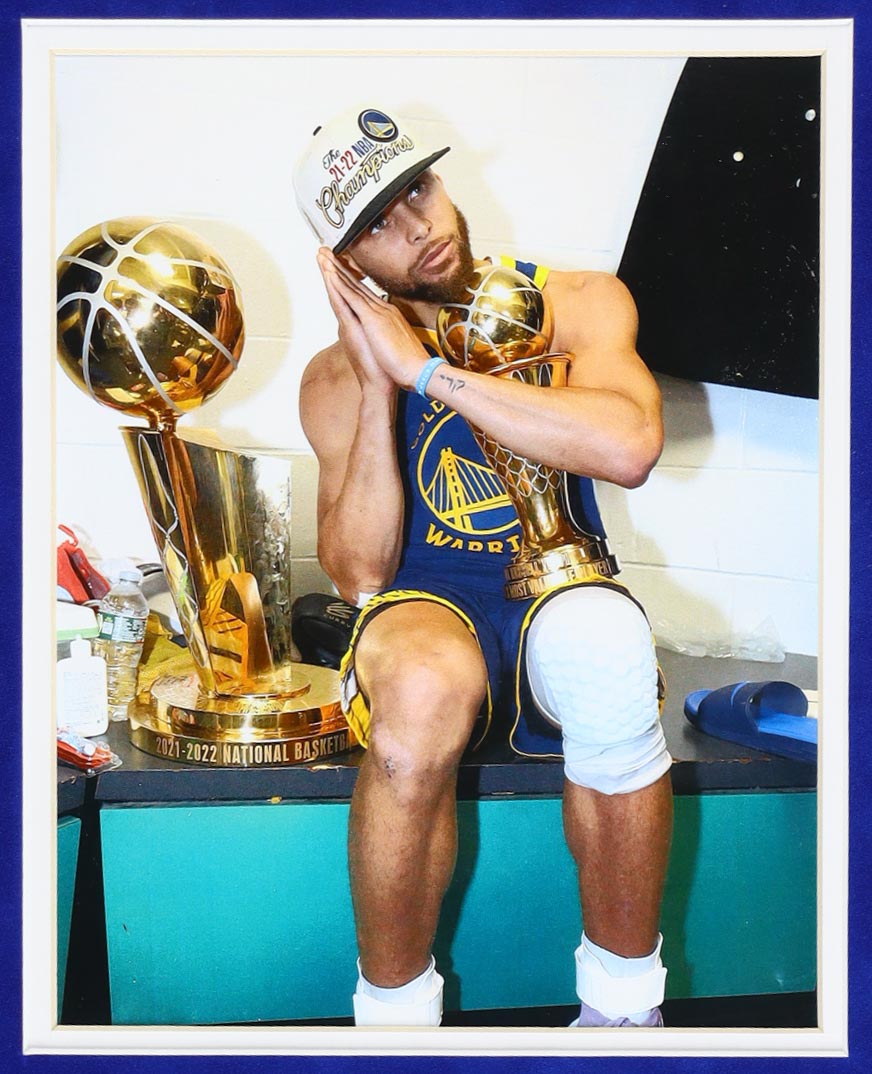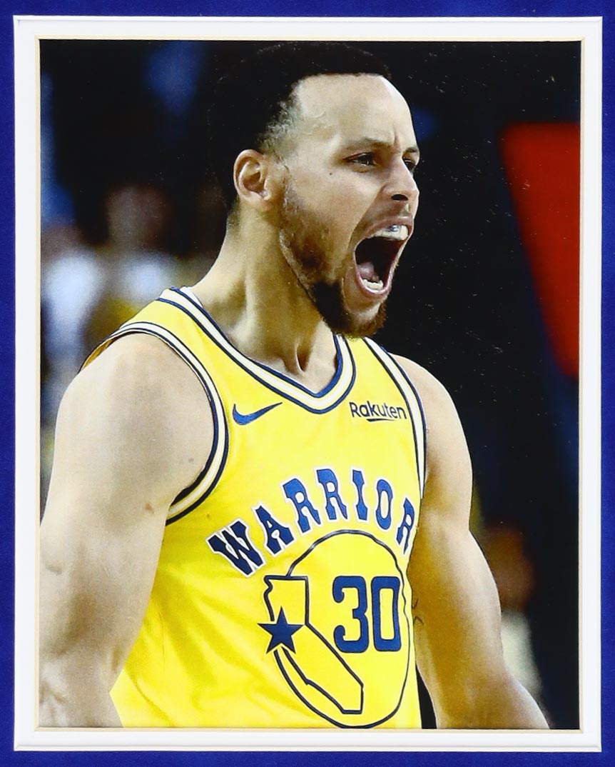 Custom frame measures approximately 35.5" x 43.5" and showcases a Golden State Warriors jersey that has been hand-signed by Stephen Curry.