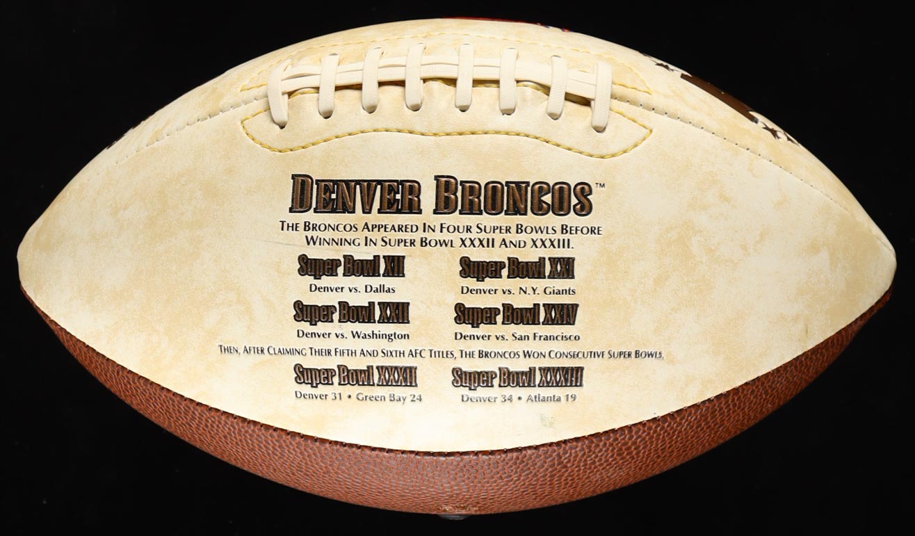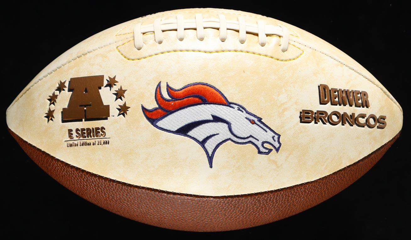 Denver Broncos Embroidered Commemorative Stat Logo Football. The football is limited edition #/25,000. Please note, the football is unsigned.
