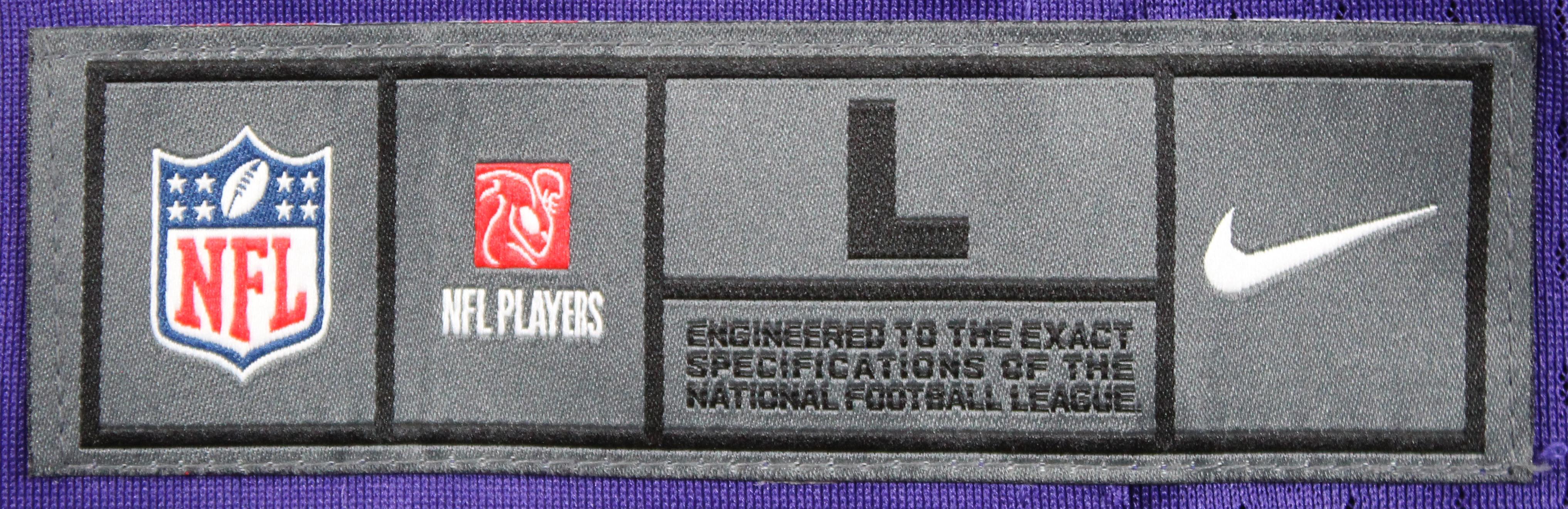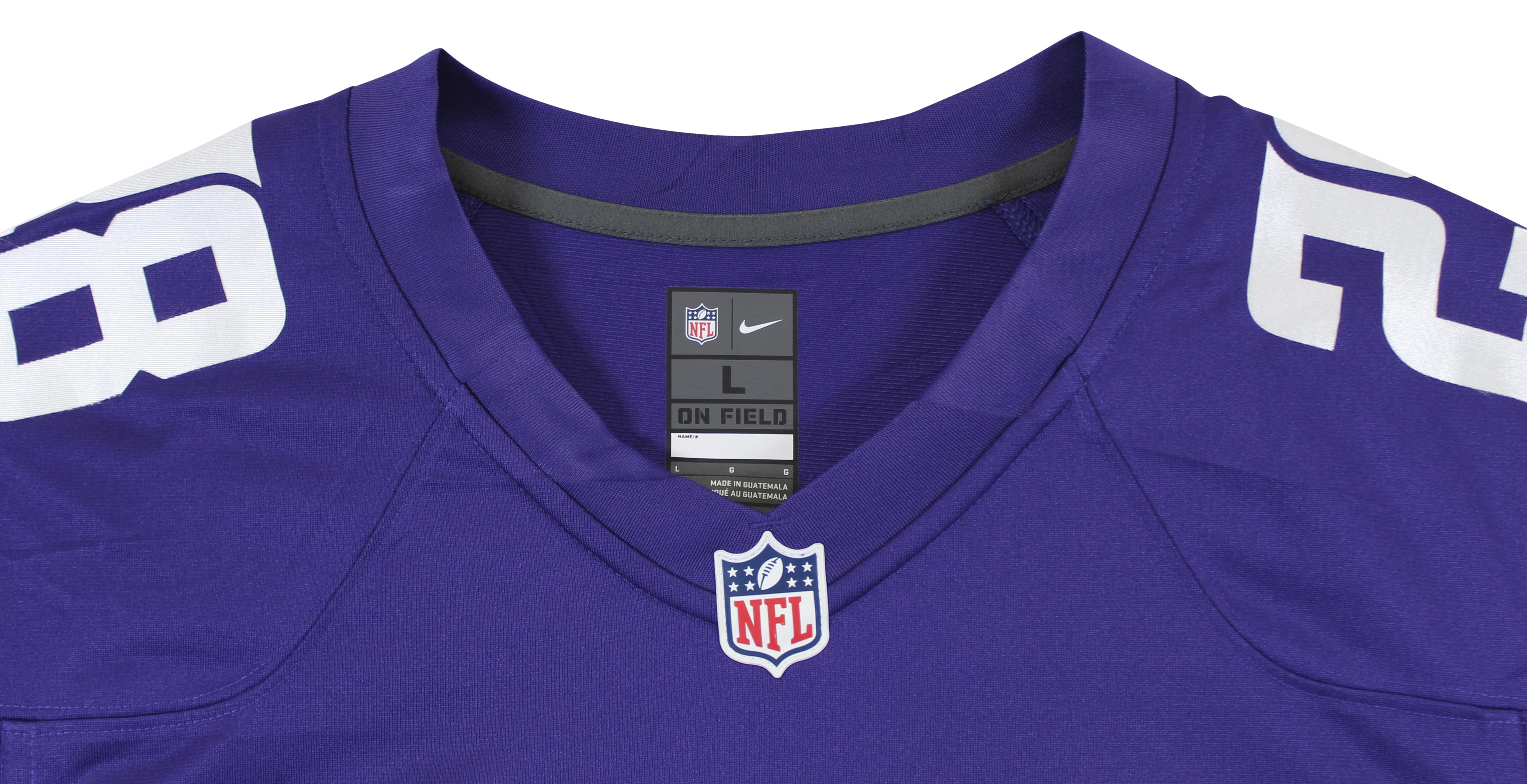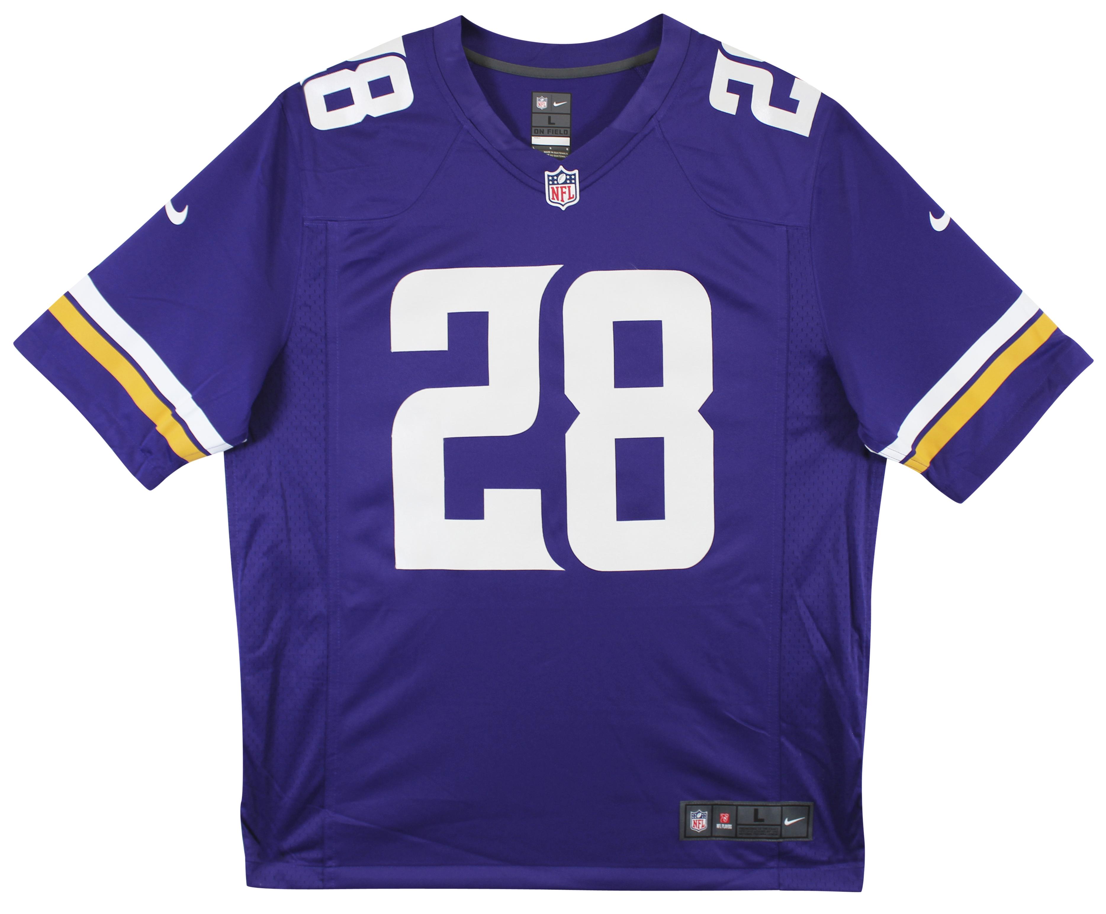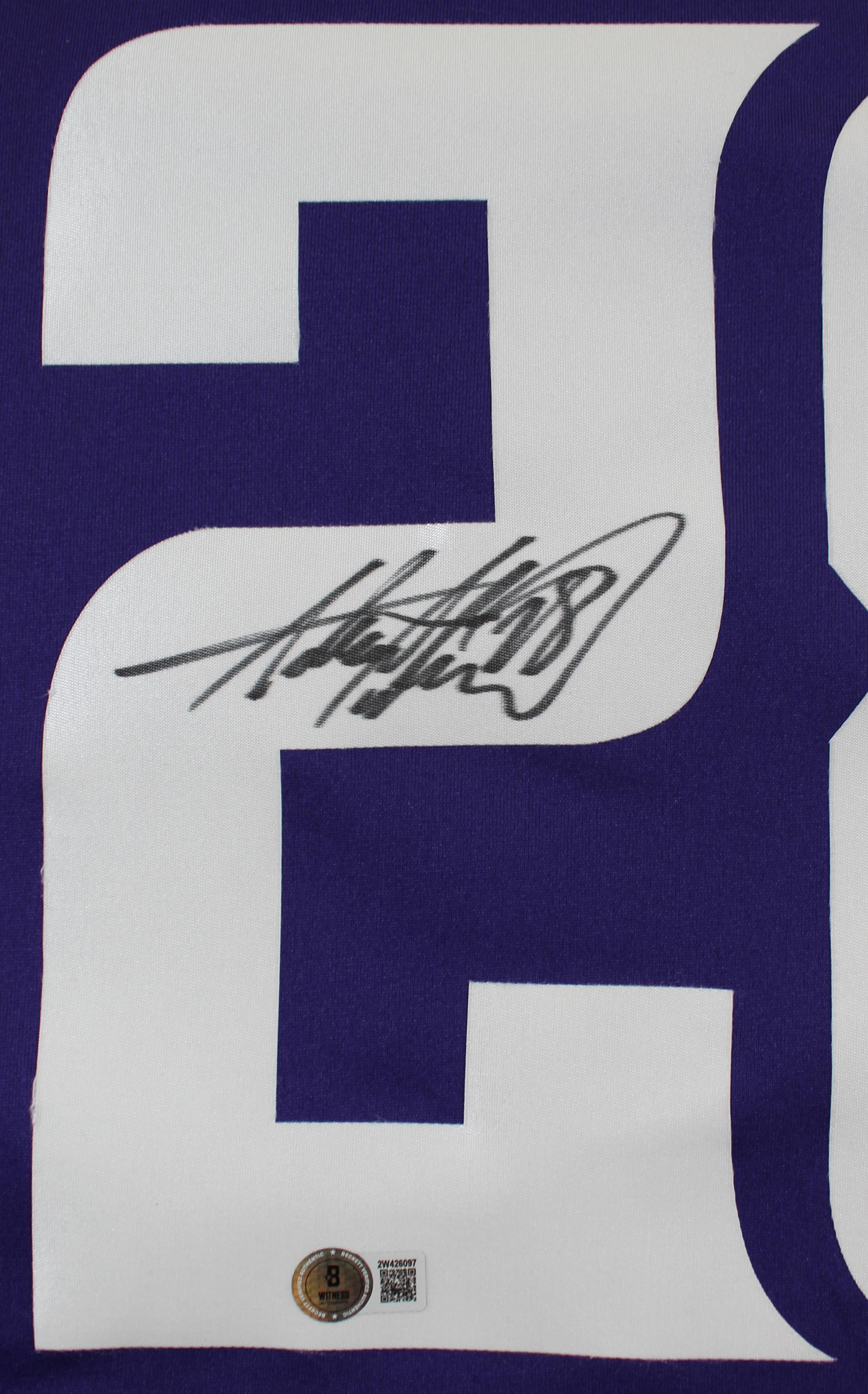 Nike style jersey with everything pressed on, size L. Hand-signed and inscribed by Adrian Peterson (Minnesota Vikings).