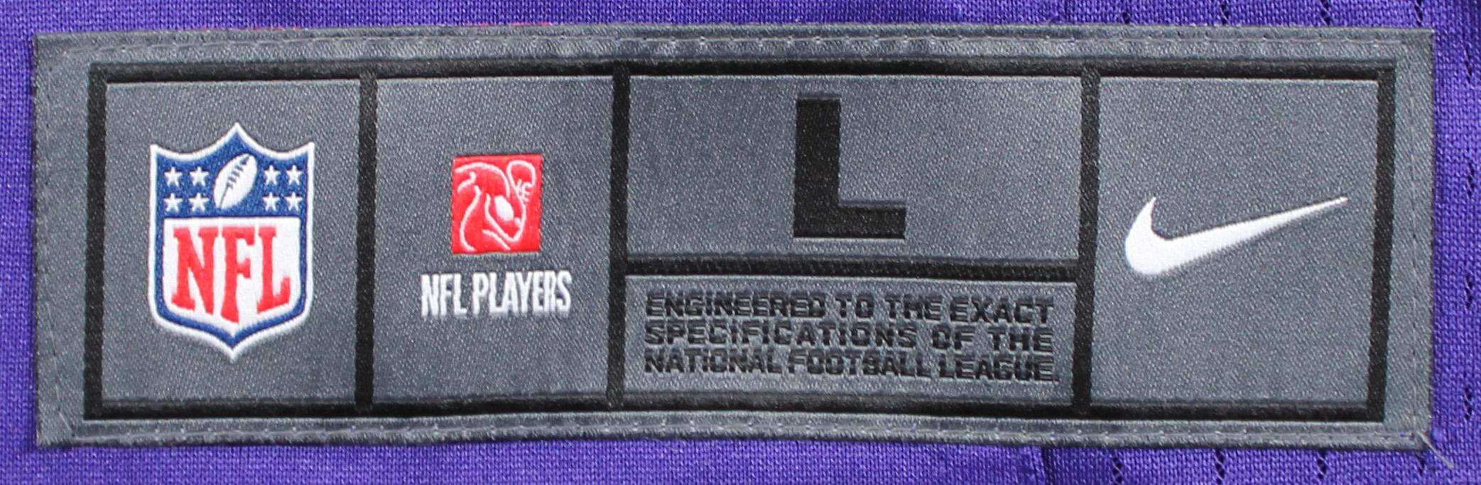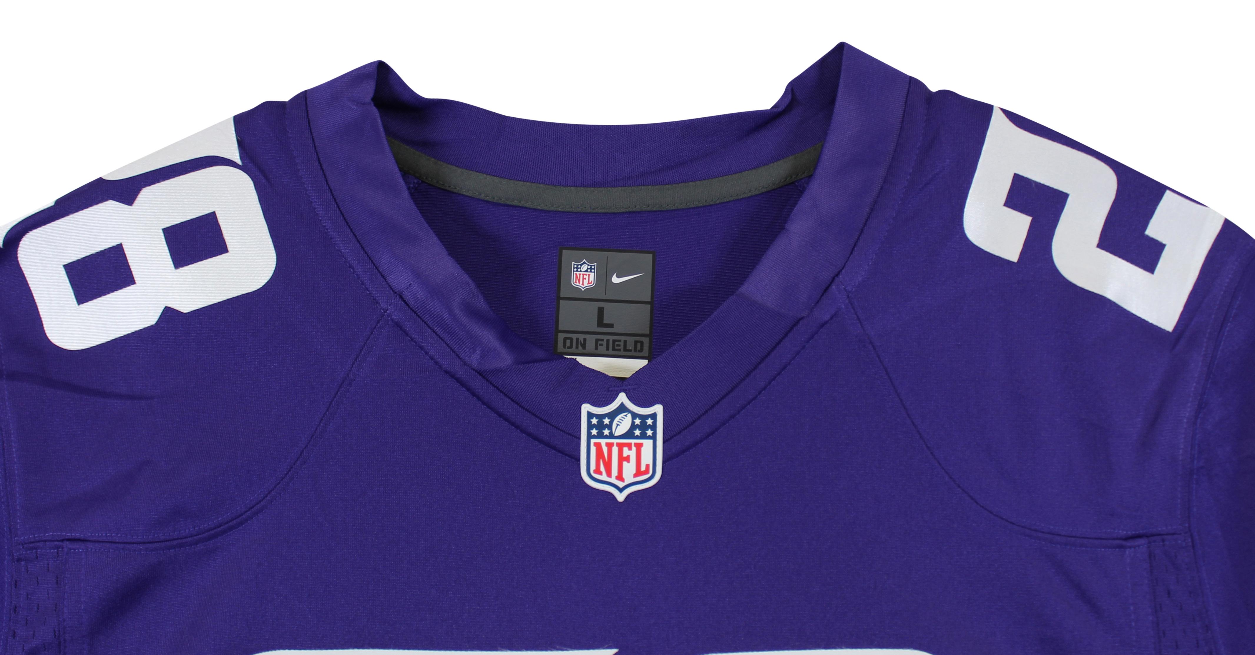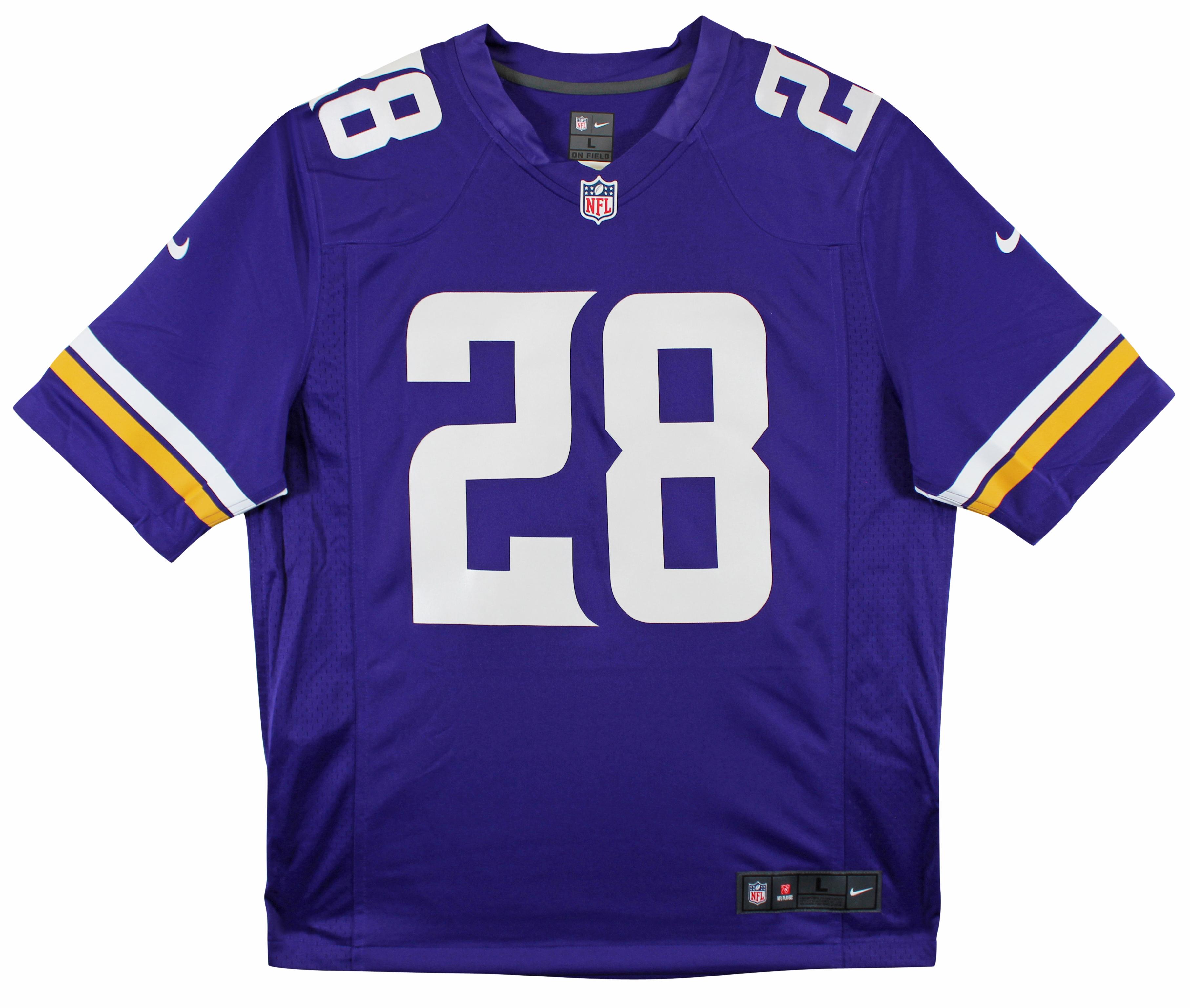 Nike style jersey with everything pressed on, size L. Hand-signed and inscribed by Adrian Peterson (Minnesota Vikings).