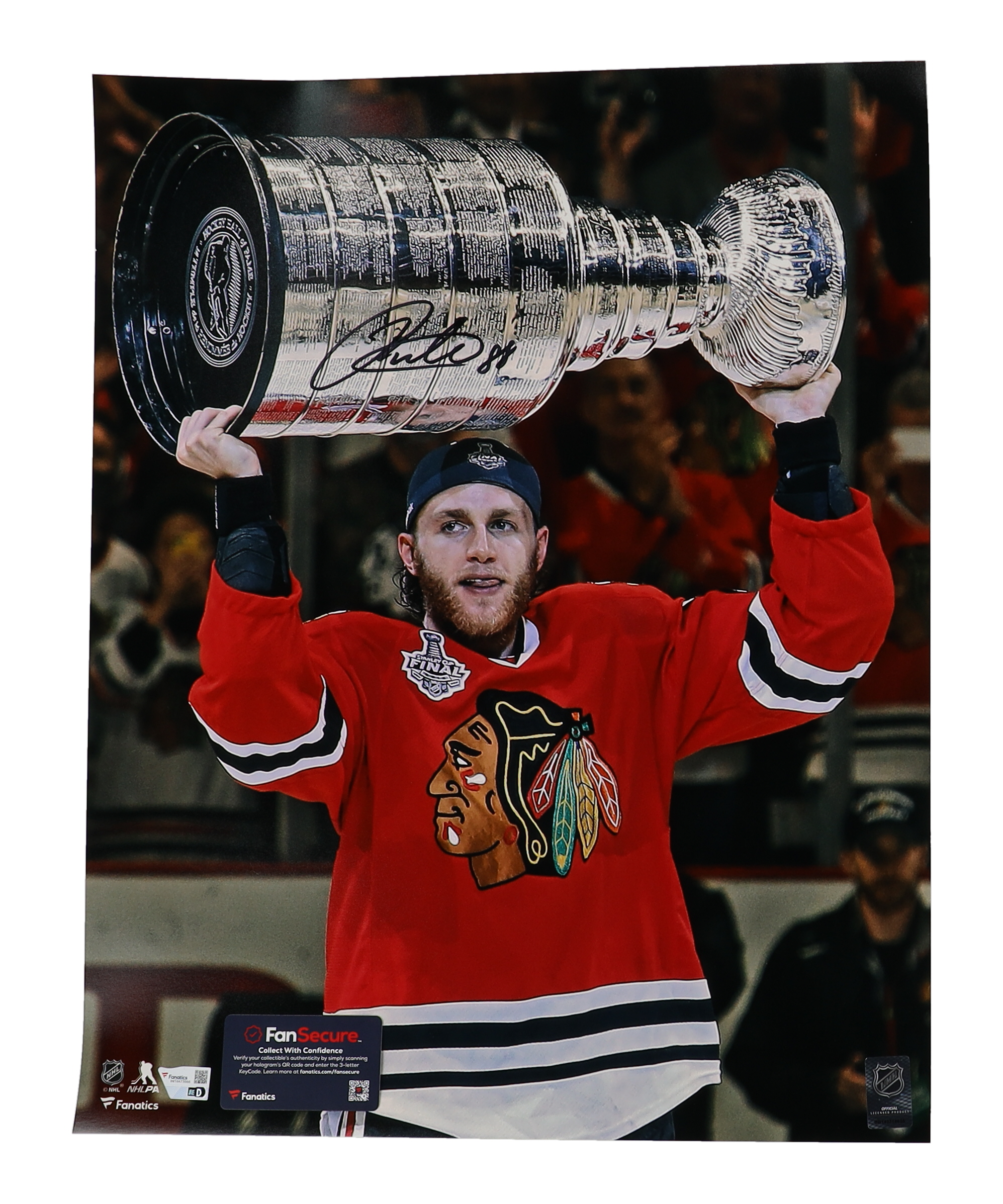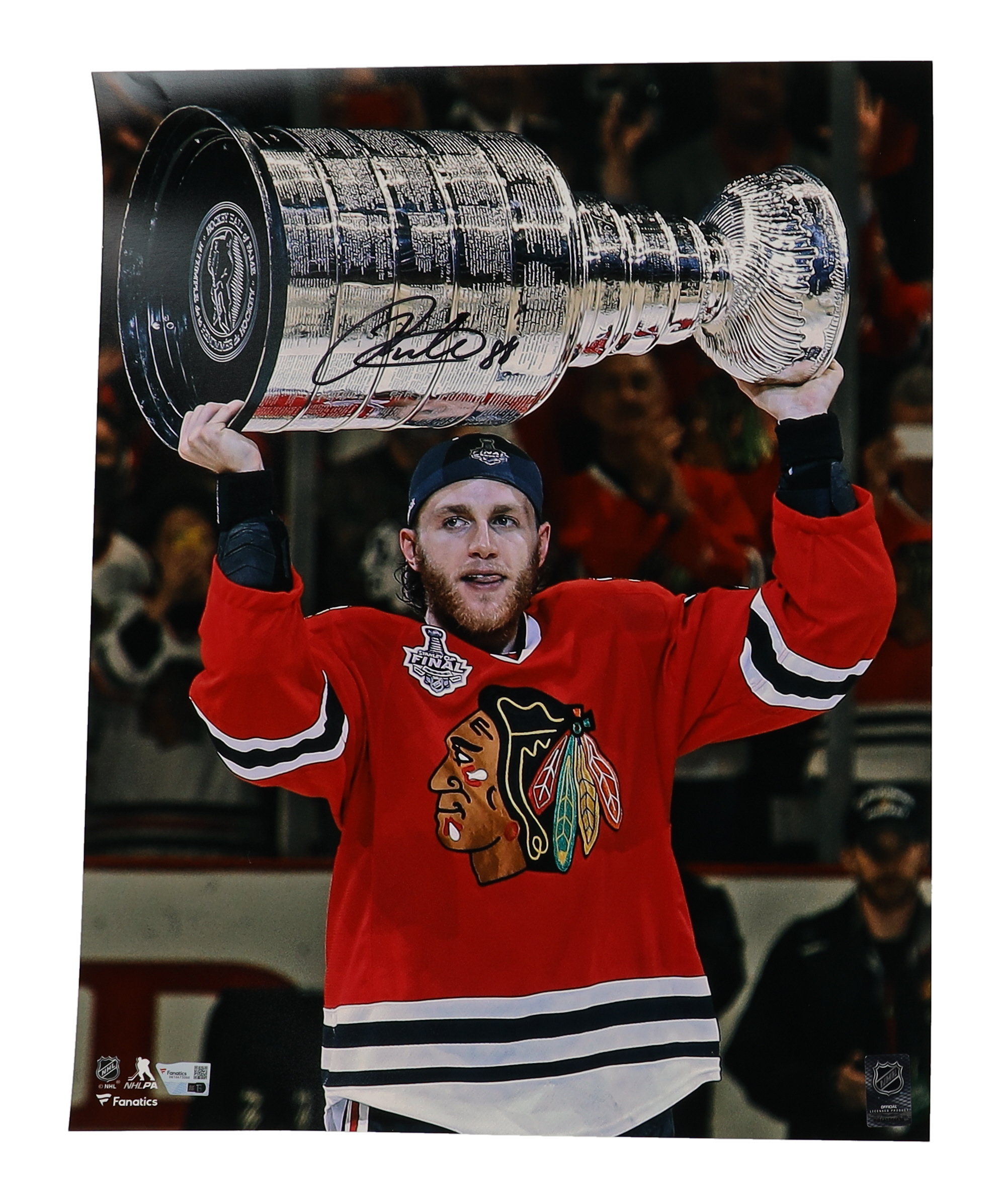 Photo measures 16" x 20" in size and has been hand-signed by Patrick Kane (Chicago Blackhawks).