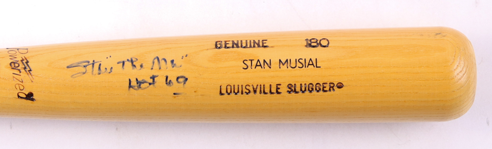 Louisville Slugger Hillerich & Bradsby Powerized baseball bat. Hand-signed and inscribed by Stan Musial (D. 2013, St. Louis Cardinals, HOF). Please note the PSA hologram is faded but is 1A52633.