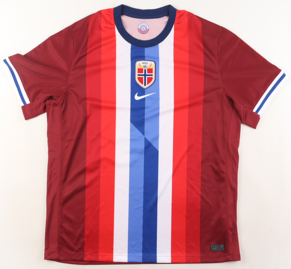 Nike jersey. Everything pressed on, size XL. Hand-signed by Erling Haaland.