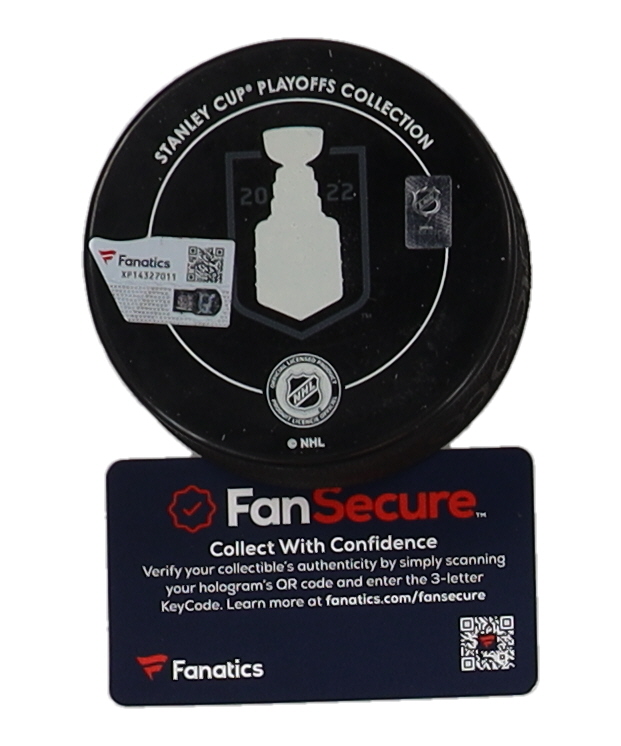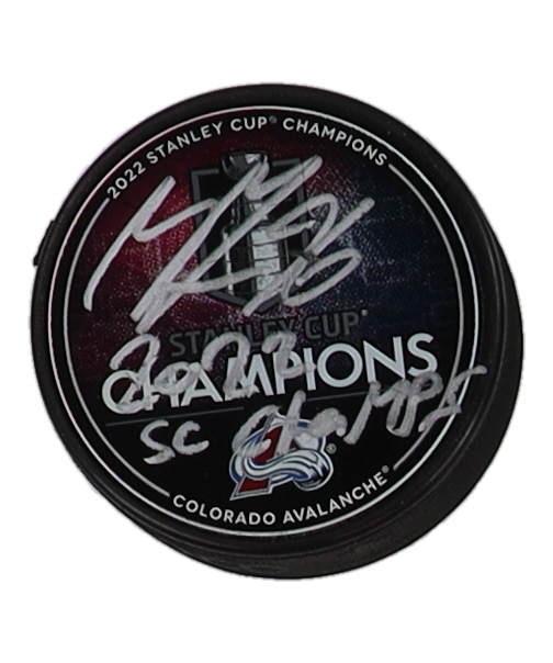 Colorado Avalanche 2022 Stanley Cup Champions Logo Hockey Puck. Hand-signed and inscribed by Mikko Rantanen. Please note, the signature has been smudged and there is scuffing throughout the puck.