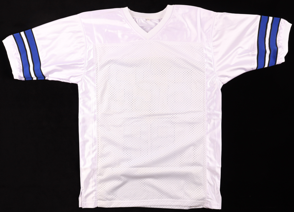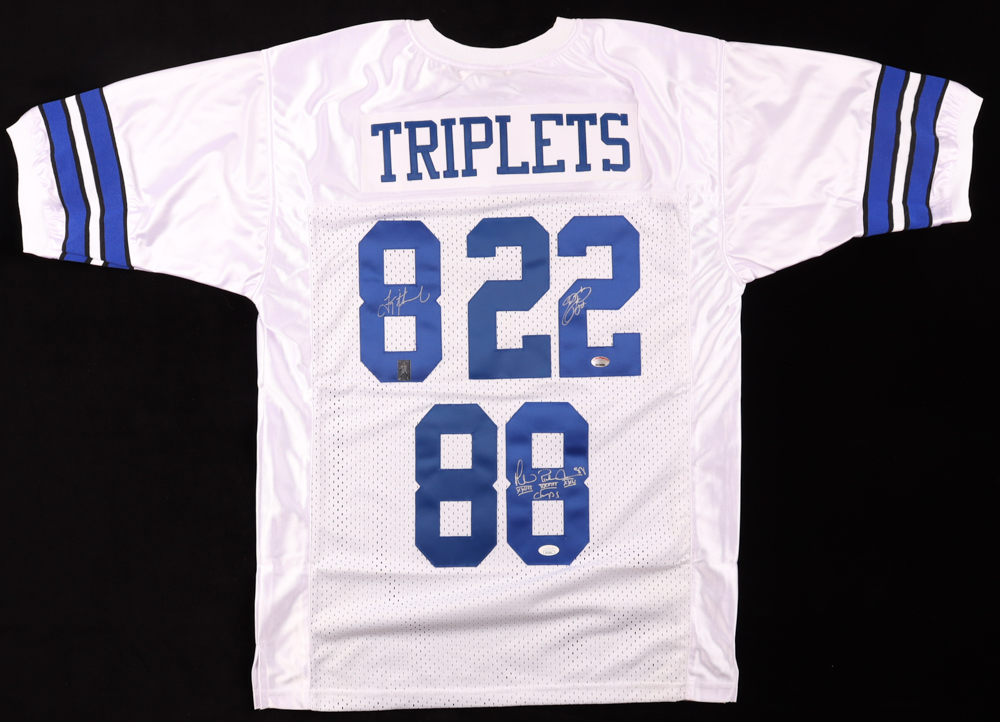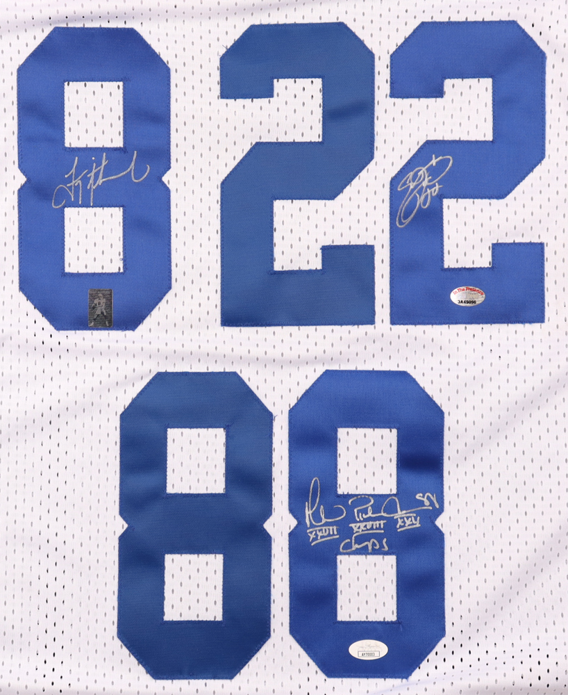 Custom jersey. Everything is sewn on, size XL. Hand-signed and inscribed by Emmitt Smith (HOF), Troy Aikman (HOF), & Michael Irvin (HOF). The jersey has been inscribed by Michael Irvin.