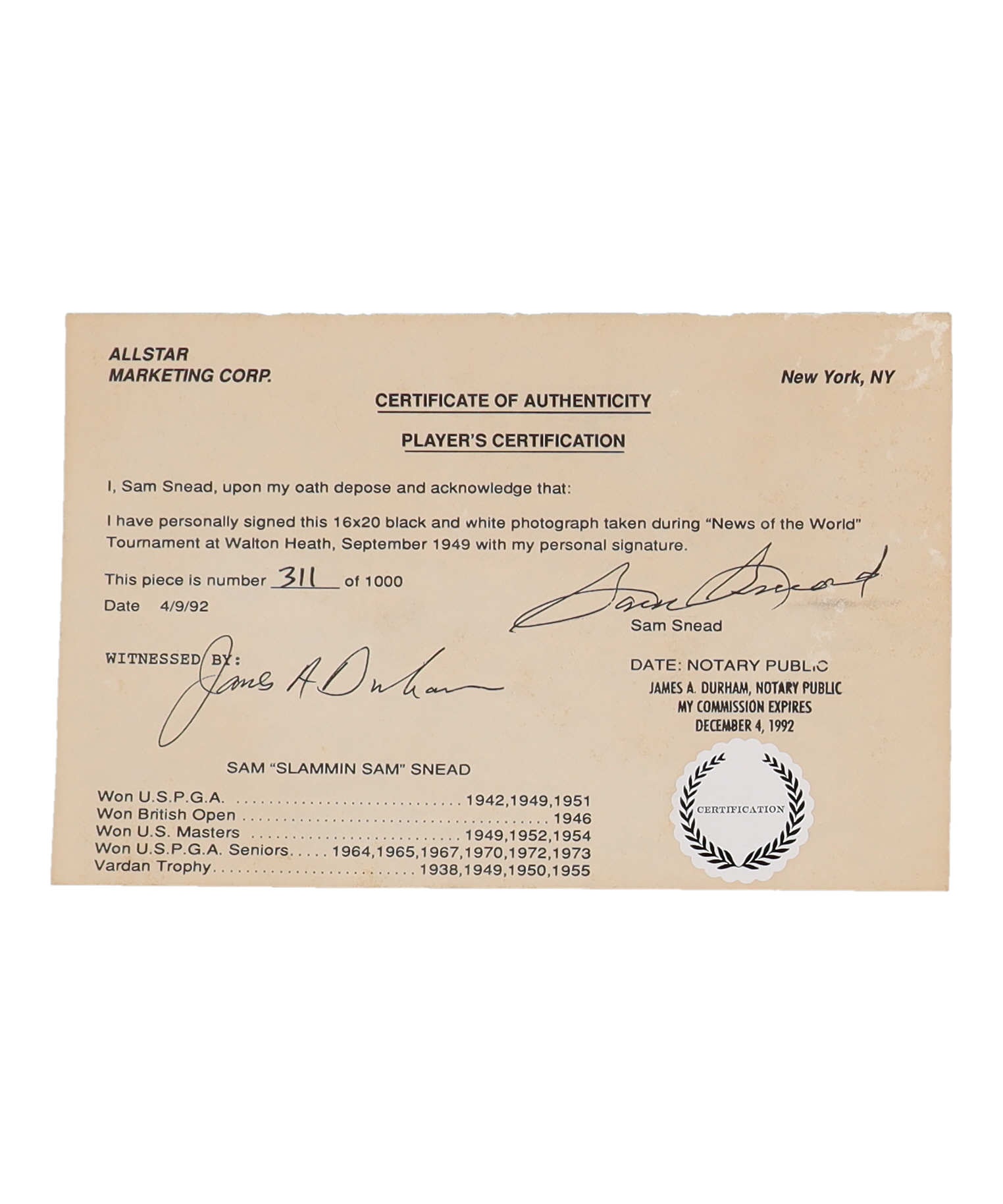 Photo measures 16" x 20" in size. Hand-signed by Sam Snead (D. 2002, HOF). Limited edition hand-numbered #311/1,000.