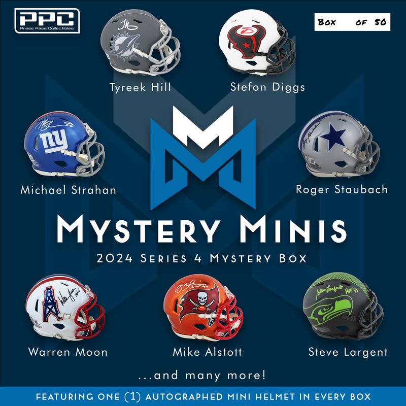 The Press Pass Collectibles 2024 mystery mini helmet mystery box includes one (1) mini helmet from your favorite NFL teams. Some boxes will feature mini helmets Warren Moon, Mike Alstott, Steve Largent, and many more!