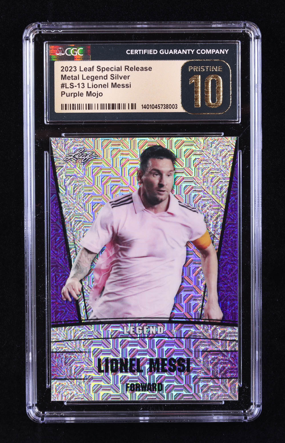 Lionel Messi 2023 Leaf Metal Special Release Legend Silver Mojo Purple #LS13 #8/15 (CGC 10 | Pristine Black Label)