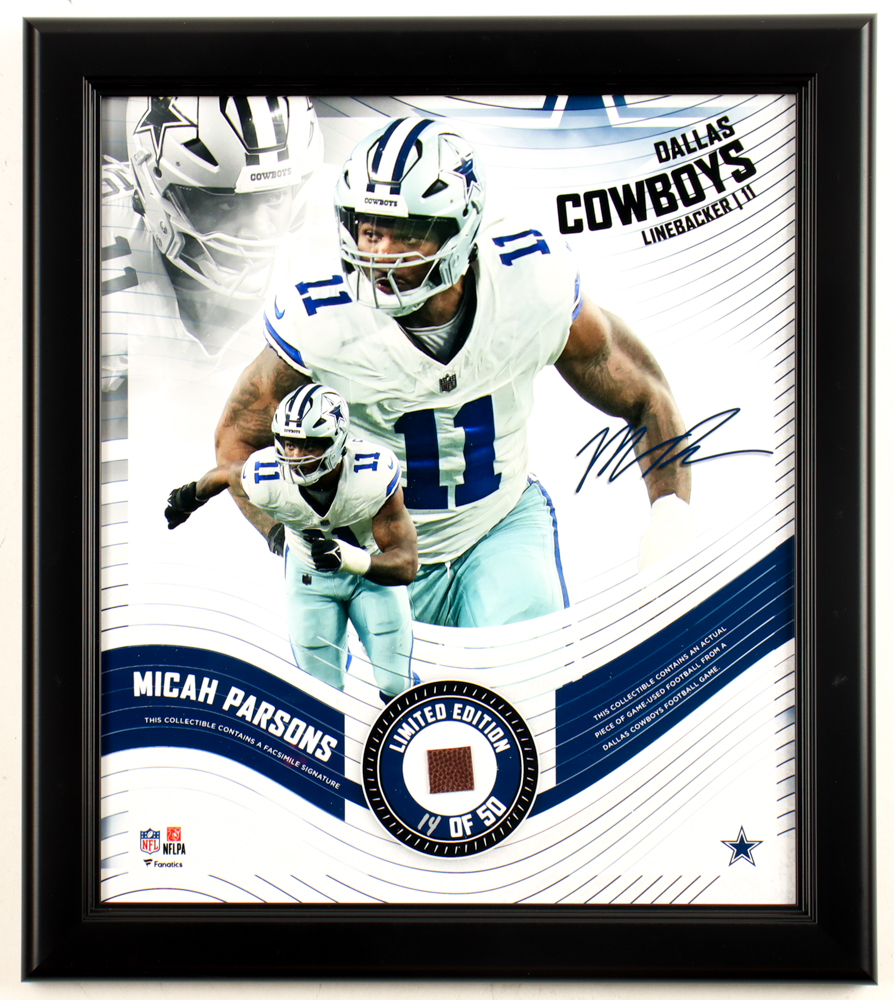 Custom frame measures approximately 15" x 17" in size and features a piece of a football used in-game by the Dallas Cowboys affixed to a photo of Micah Parsons. The display is limited edition numbered #14/50. Please note, the display is unsigned and the signature is a facsimile.