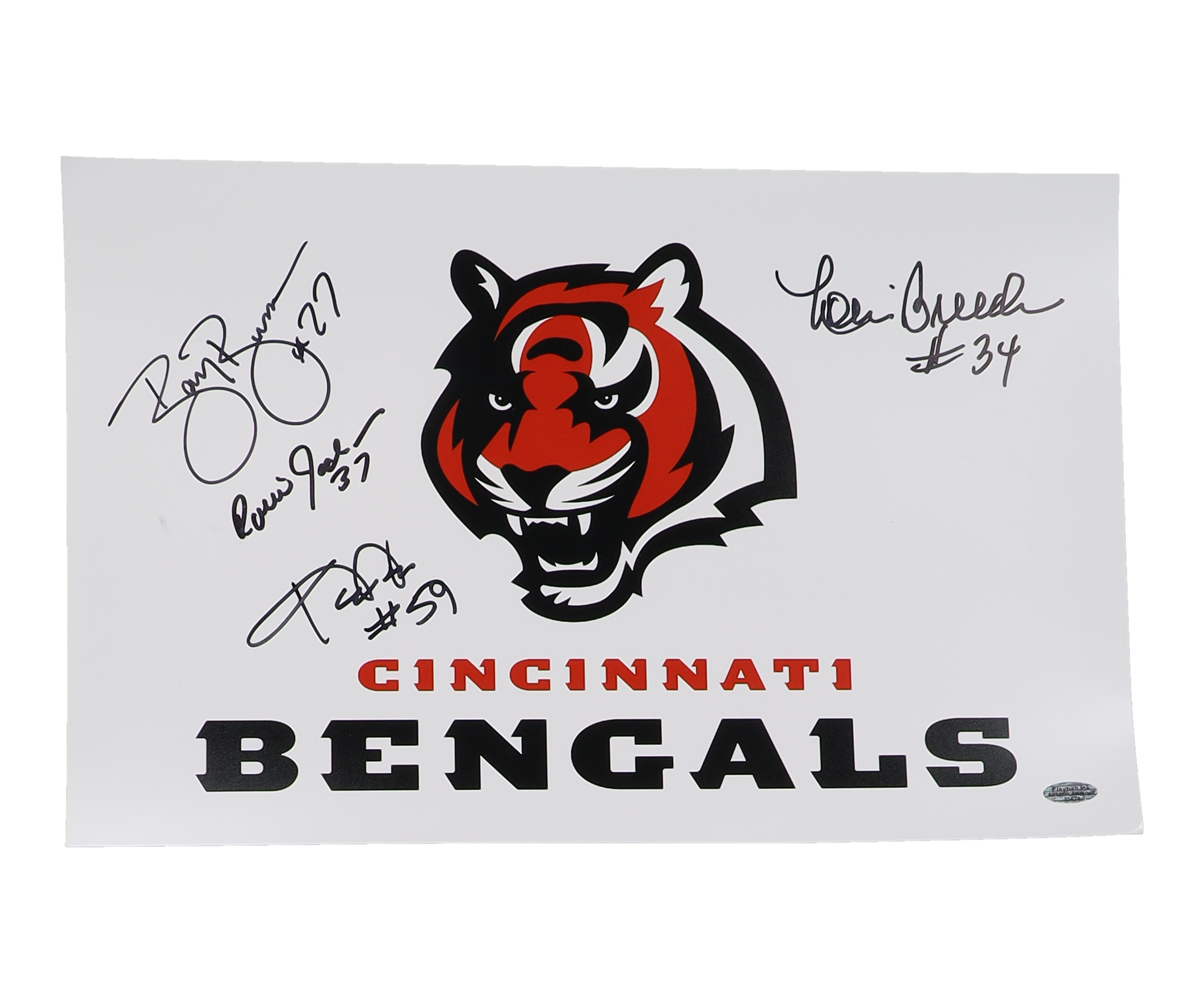 Photo measures 11" x 17" in size and has been hand-signed by Barney Bussey, Robert Jackson, Louis Breeden and Kevin Walker (Cincinnati Bengals).