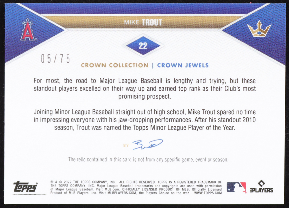 Mike Trout 2022 Topps X Bobby Witt Jr. Crown Collection Crown Jewels Relics Green #22 #05/75