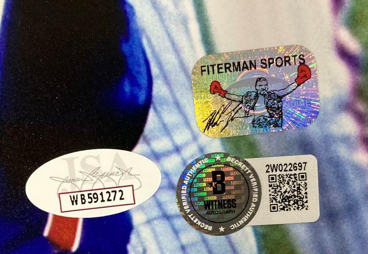 The autograph(s) includes an official James Spence Authentication (JSA) hologram and matching COA, an official Beckett Authentication Services serially numbered hologram as well as an official Mike Tyson hologram from Fiterman Sports Group for authenticity purposes. The signing of this item was witnessed by JSA and Beckett.