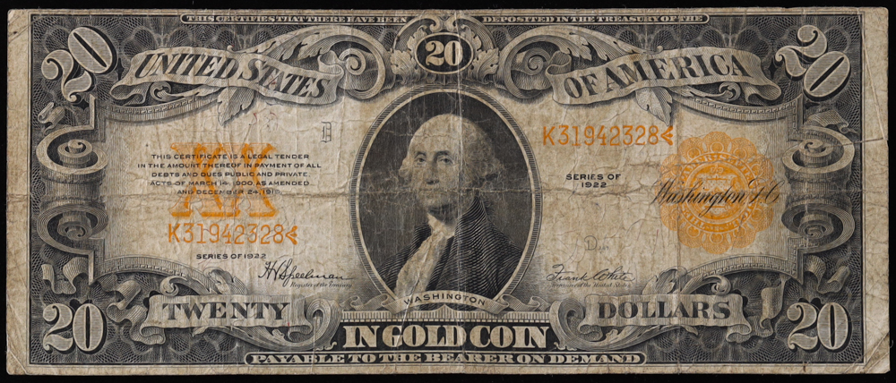 1922 United States $20 Twenty Dollar Gold Certificate Banknote