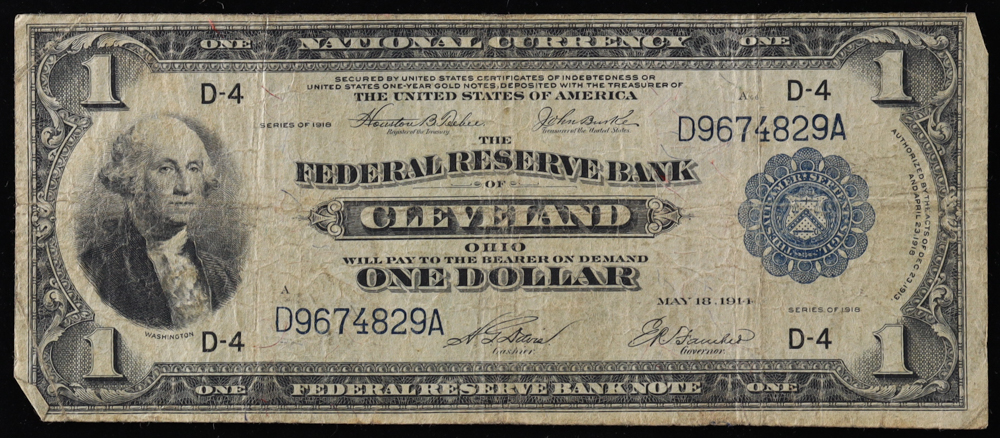 1914 United States Federal Reserve Bank of Cleveland $1 One Dollar National Currency Banknote