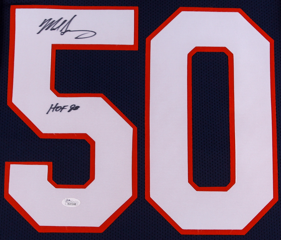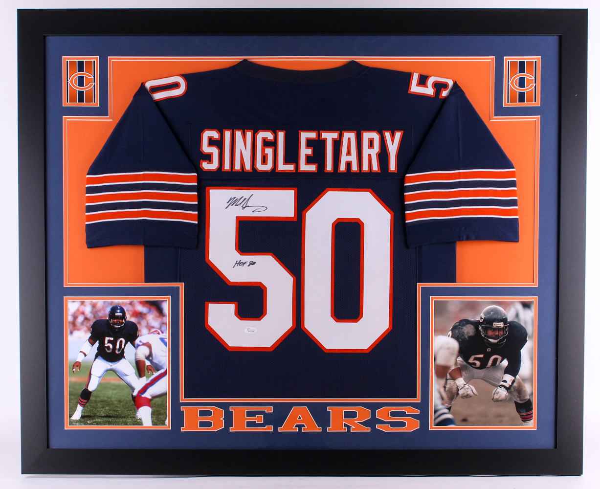 Custom frame measures approximately 35" x 43" in size and features a jersey which has been hand-signed in black felt tip pen by Mike Singletary (HOF).