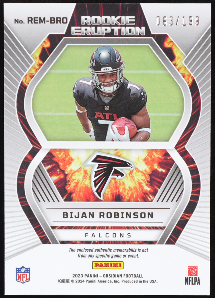 Bijan Robinson 2023 Panini Obsidian Rookie Eruption Memorabilia #REMBRO RC #063/199