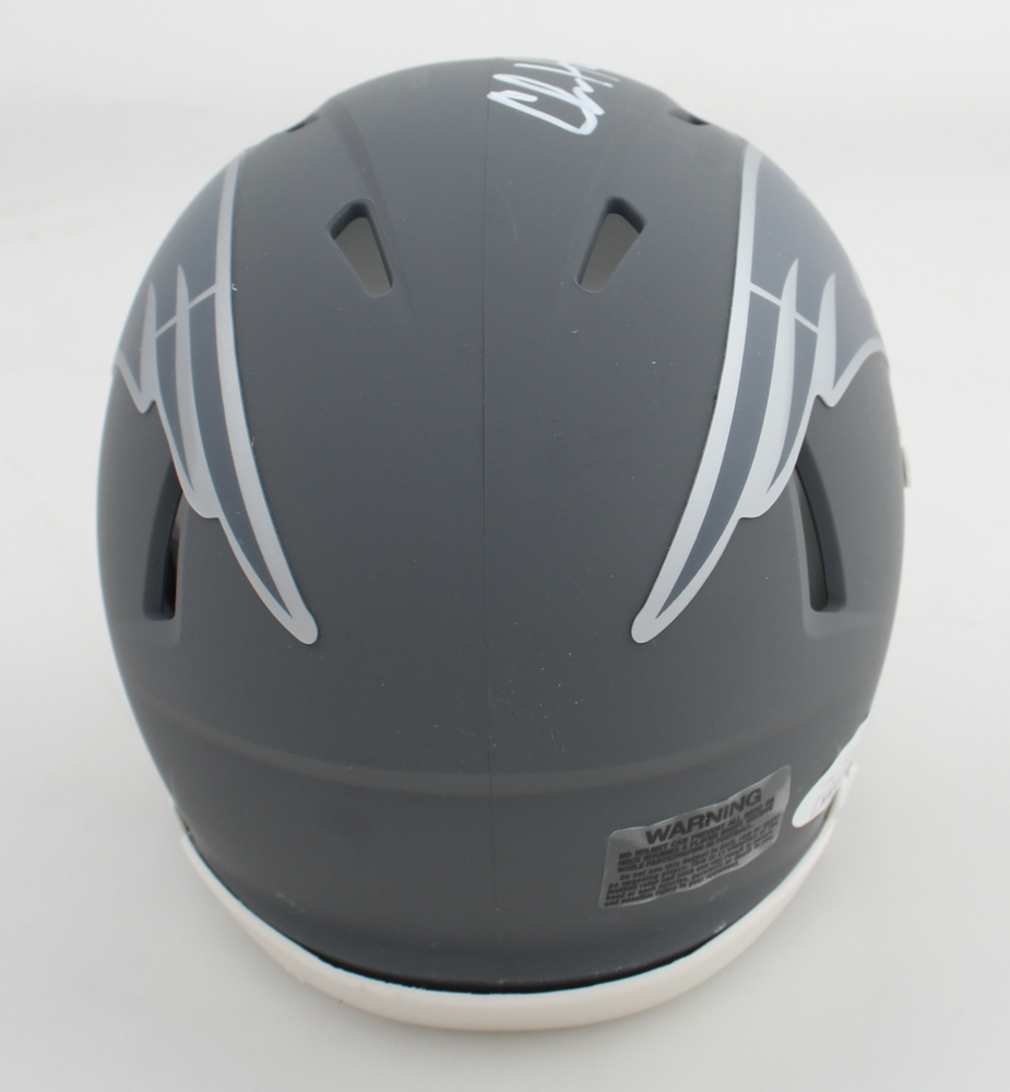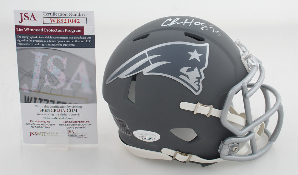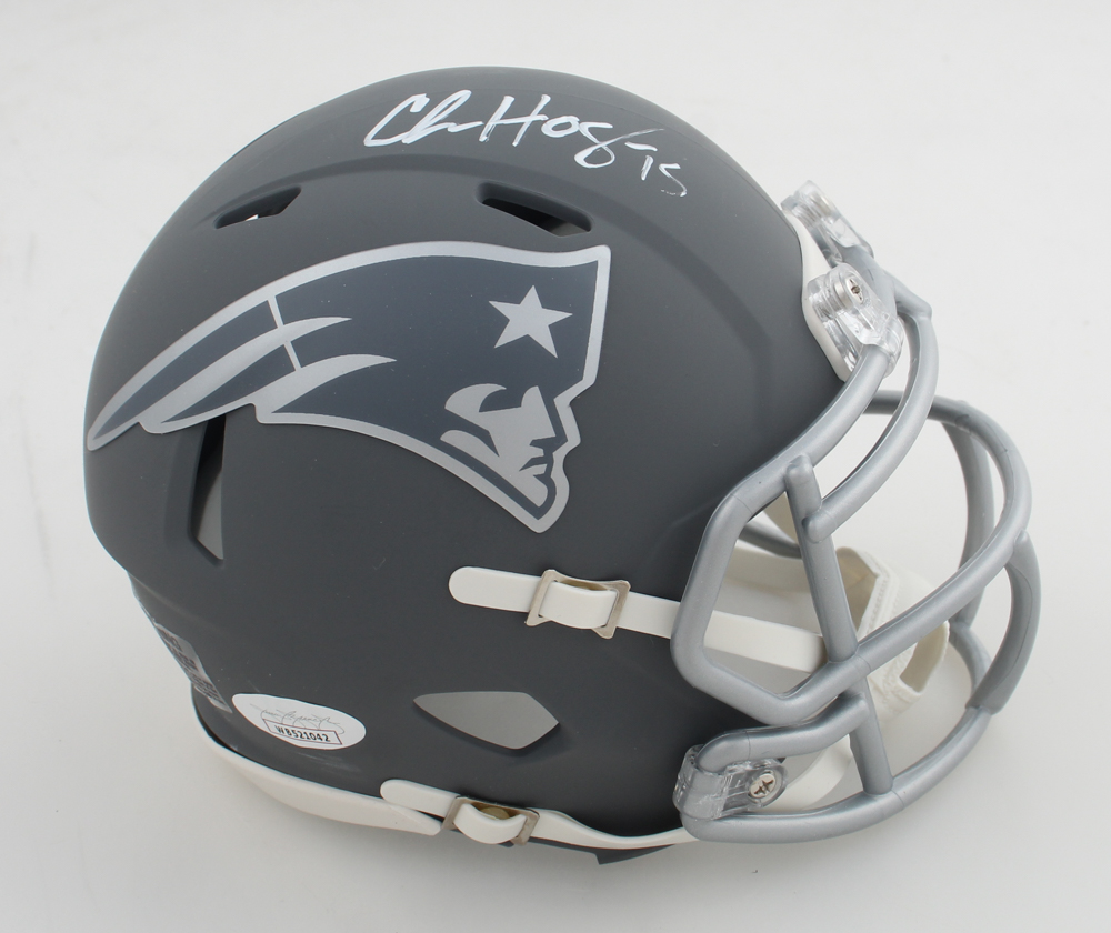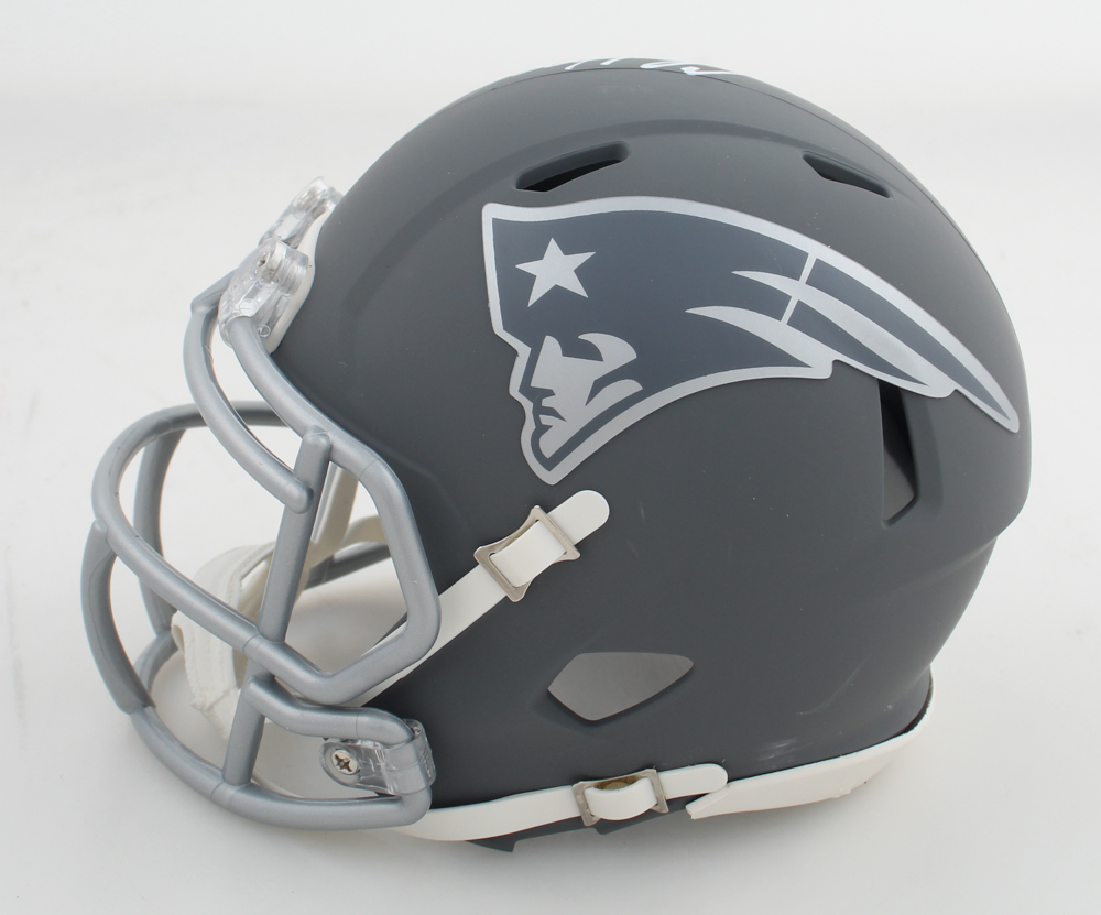 Riddell New England Patriots slate alternate speed mini helmet has been hand-signed by Chris Hogan.