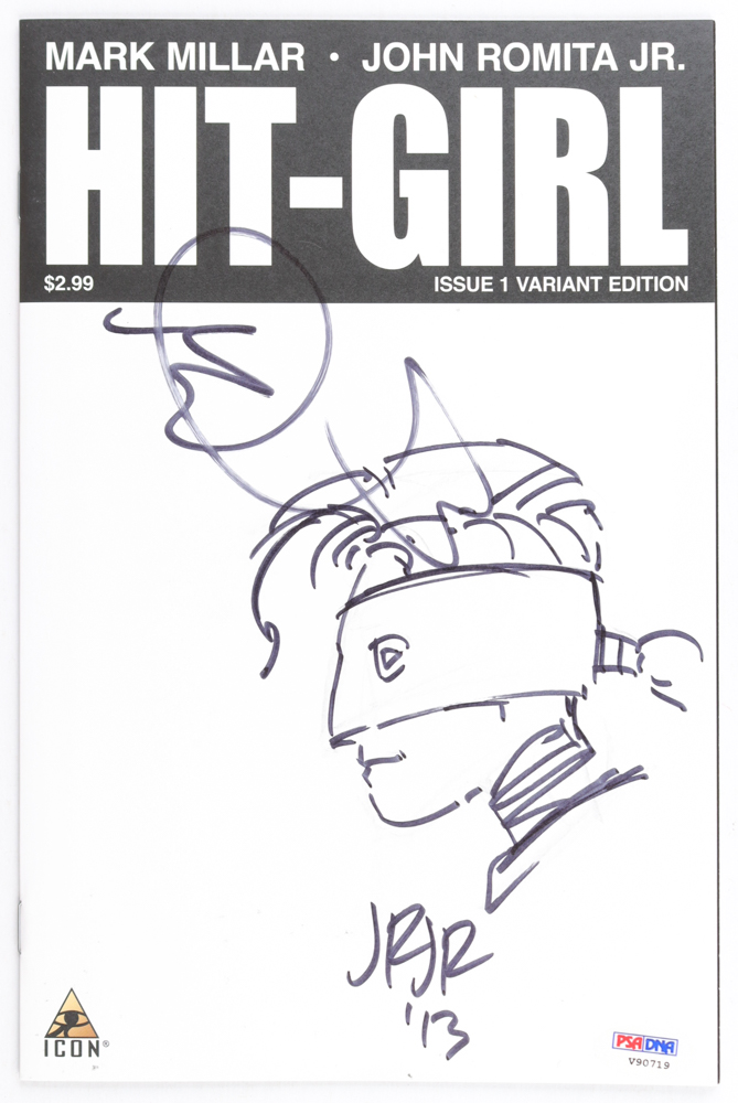 August 2012 Icon comic book has been hand-signed by Chloe Moretz (Hit Girl) and John Romita Jr. (Artist). Romita has sketched the "Hit-Girl" character above his signature.