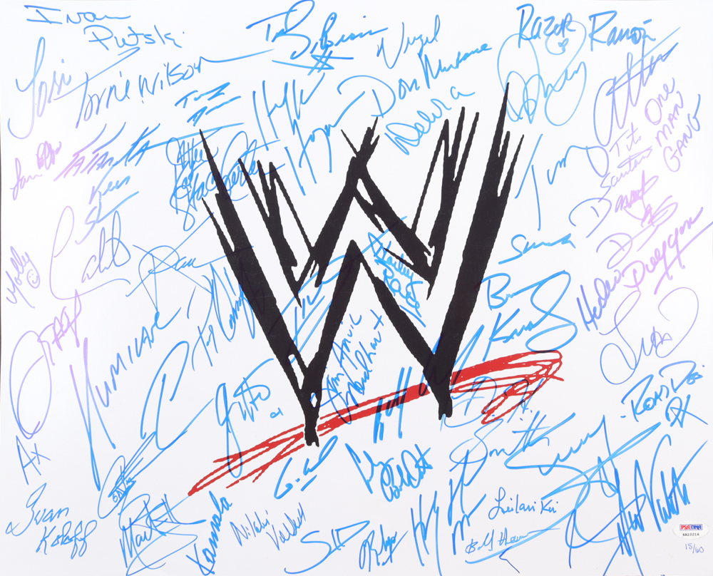 Photo measures 16" x 20" in size. Hand-signed by (51) WWE Legends. Notable signatures include Hulk Hogan, X-Pac, Razor Ramon, Ivan Koloff, Nikolai Volkoff, Ted DiBiase, Miss Kitty, Virgil, Don Muraco, Paul Orndorff, Cowboy Bob Orton, Honky Tonk Man, Bobby Heenan, Sunny, Greg Valentine, Hacksaw Jim Duggan, Tito Santana and Tony Atlas. Limited edition #15/60.