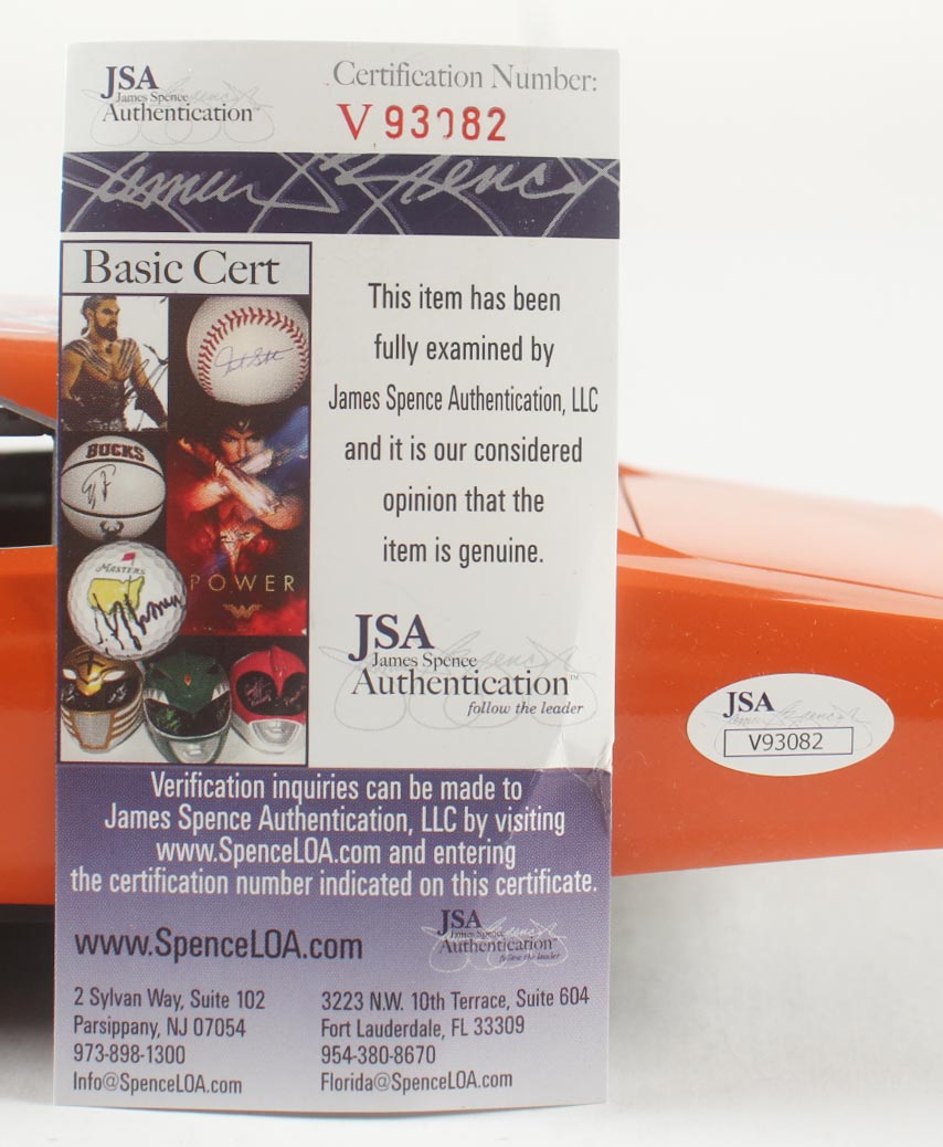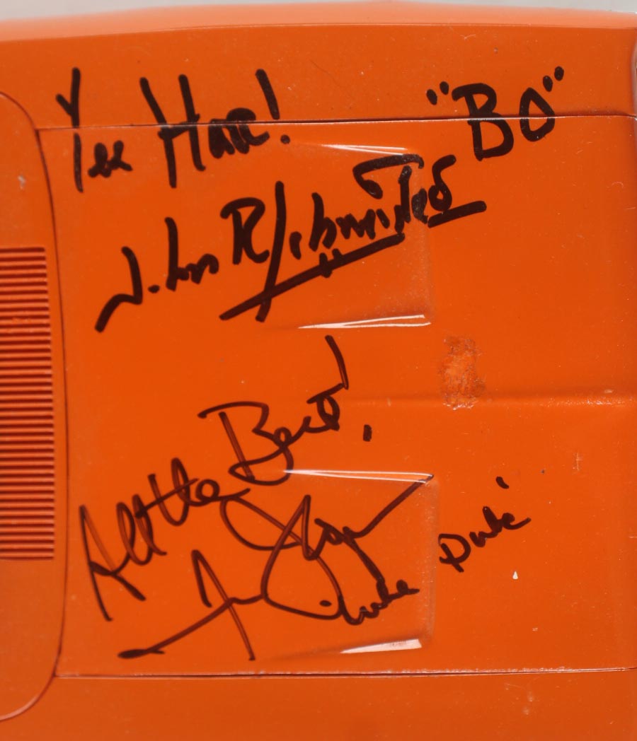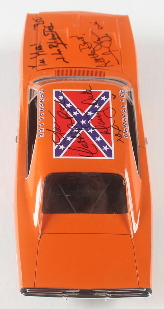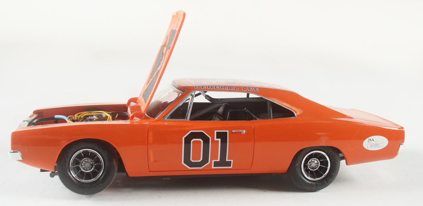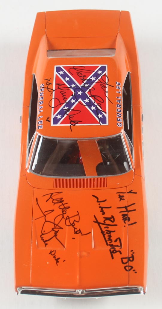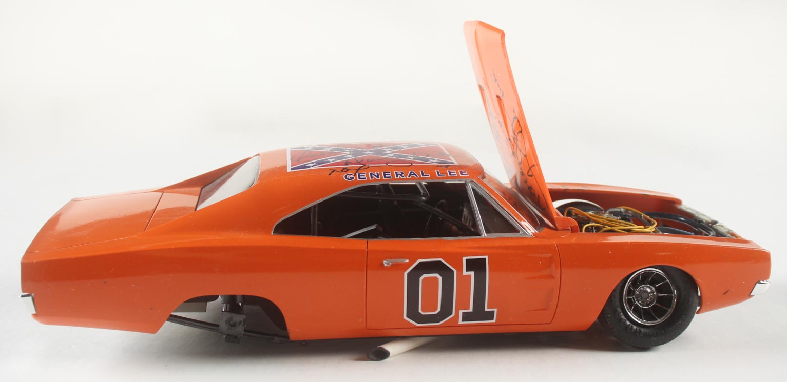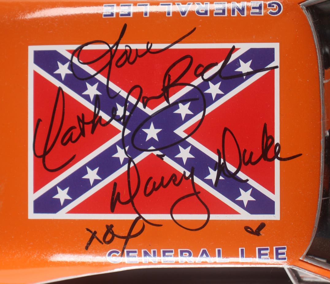 General Lee 1969 Dodger Charger 1:18 die-cast car has been hand-signed and inscribed by (3) with John Schneider (Bo Duke), Tom Wopat (Luke Duke) and Catherine Bach (Daisy Duke).