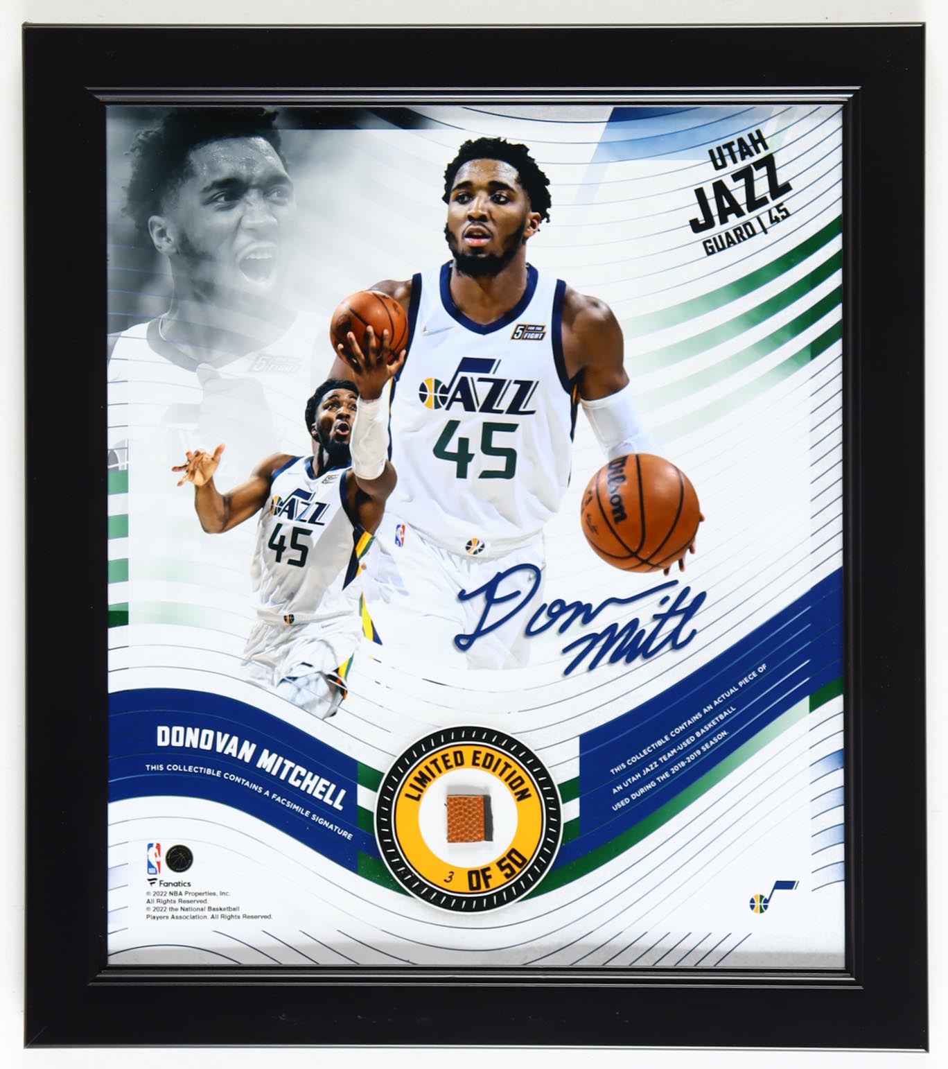 Custom frame measures approximately 15" x 17" in size and features a piece of a basketball used in-game by the Utah Jazz affixed to a photo of Donovan Mitchell. The display is limited edition numbered #3/50. Please note, the display is unsigned, the signature is a facsimile and there is scuffing on the frame.