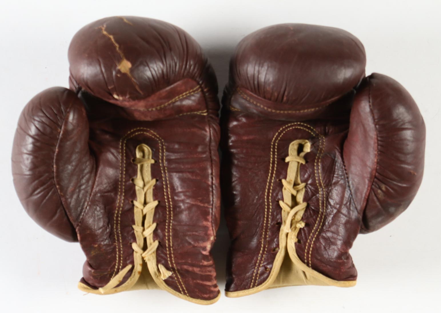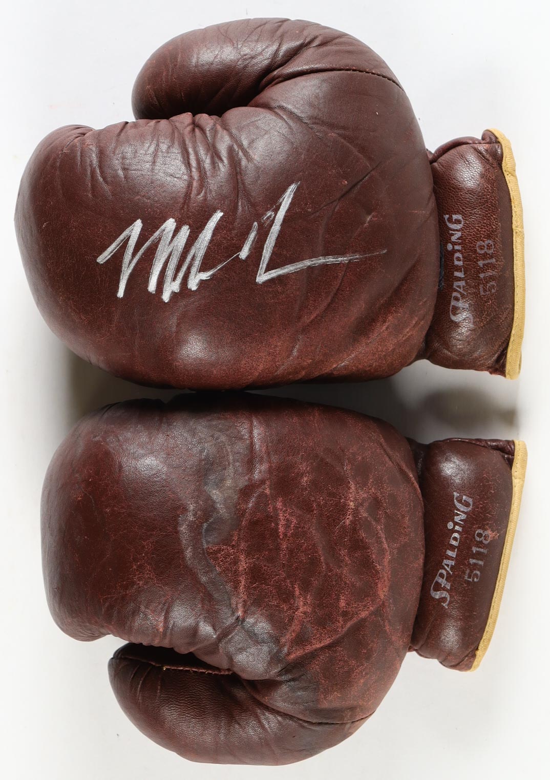 Vintage 1960 Spalding Burgundy Set of (2) Boxing Gloves. Left glove has been hand-signed by Mike Tyson (HOF). Display case included. Please refer to photos for more details on condition of the item.