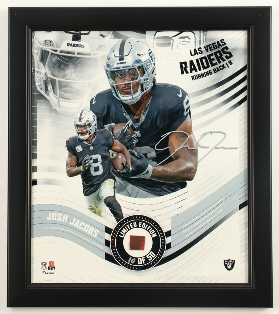 Custom frame measures approximately 15" x 17" in size and features a piece of a football used in-game by the Las Vegas Raiders affixed to a photo of Josh Jacobs. The display is limited edition numbered #10/50. Please note, the display is unsigned and the signature is a facsimile.