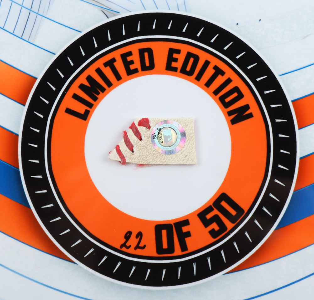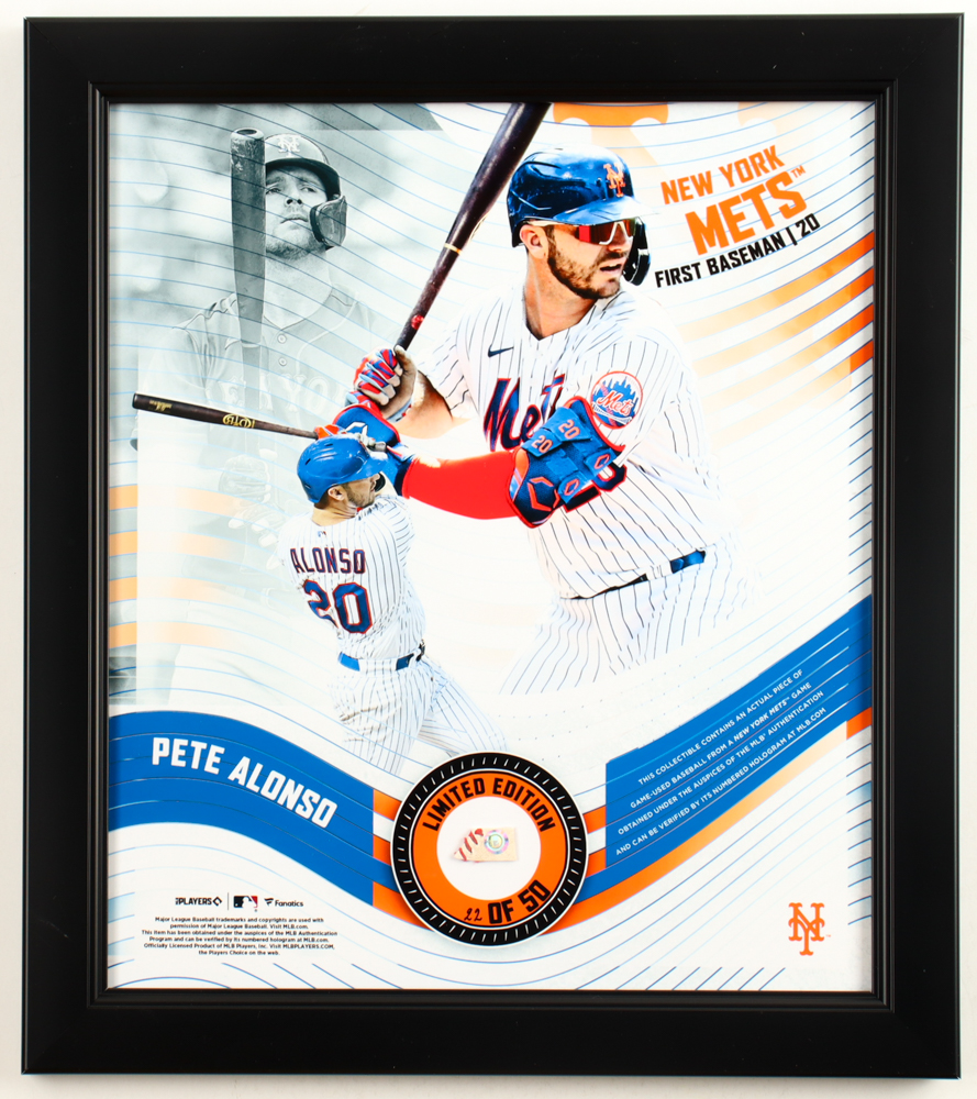 Custom frame measures approximately 15" x 17" in size and features a piece of a baseball that has been game used by the New York Mets affixed to a photo of Pete Alonso. Display is a limited edition #22/50. Please note, display is unsigned.