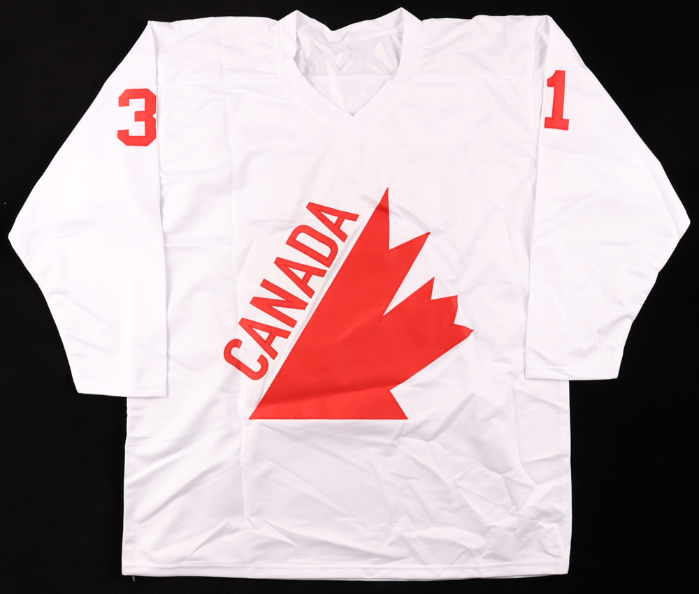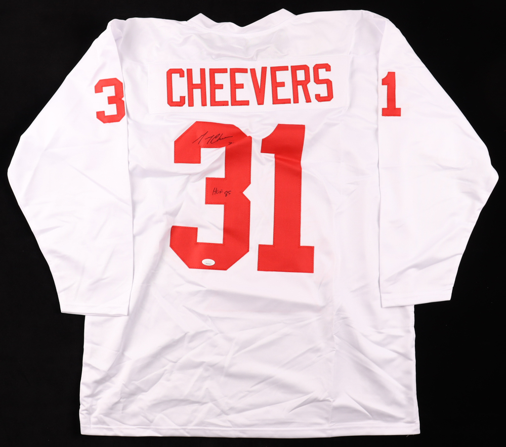Custom jersey. Everything is sewn on, size XL. Hand-signed and inscribed by Gerry Cheevers (HOF).