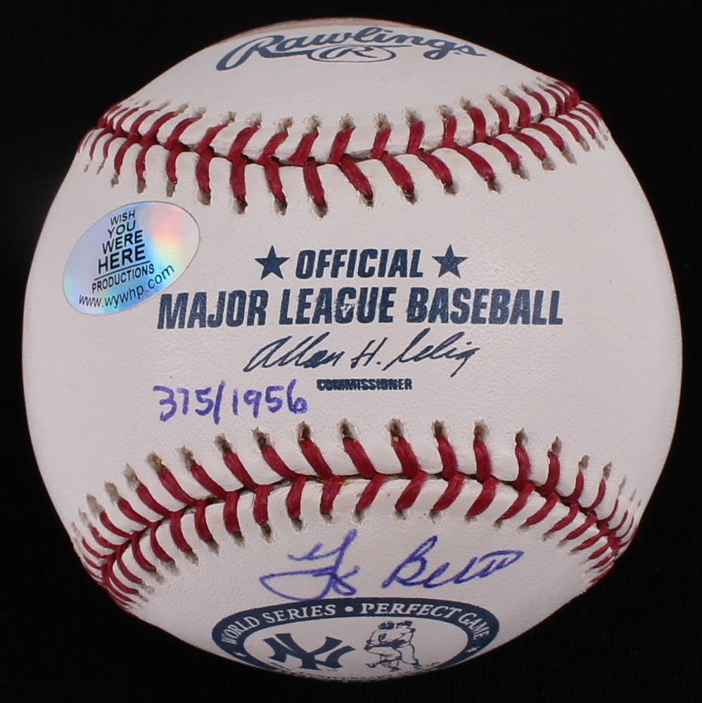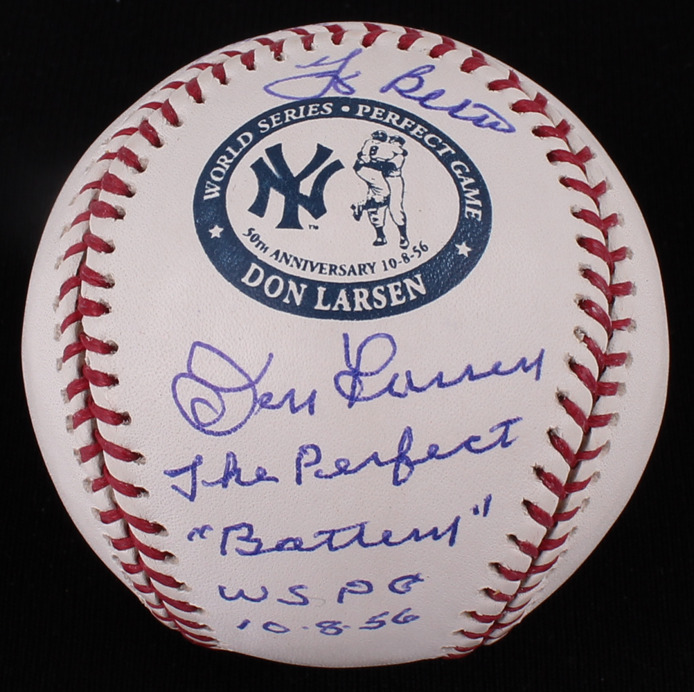 Rawlings Official Major League Baseball. Hand-signed and inscribed in blue ink pen by Yogi Berra (D. 2015, Yankees, HOF) and Don Larsen (Yankees). The baseball commemorates the 50th Anniversary of Don Larsen's perfect game in 1956. Please note, the baseball shows minor signs of toning.