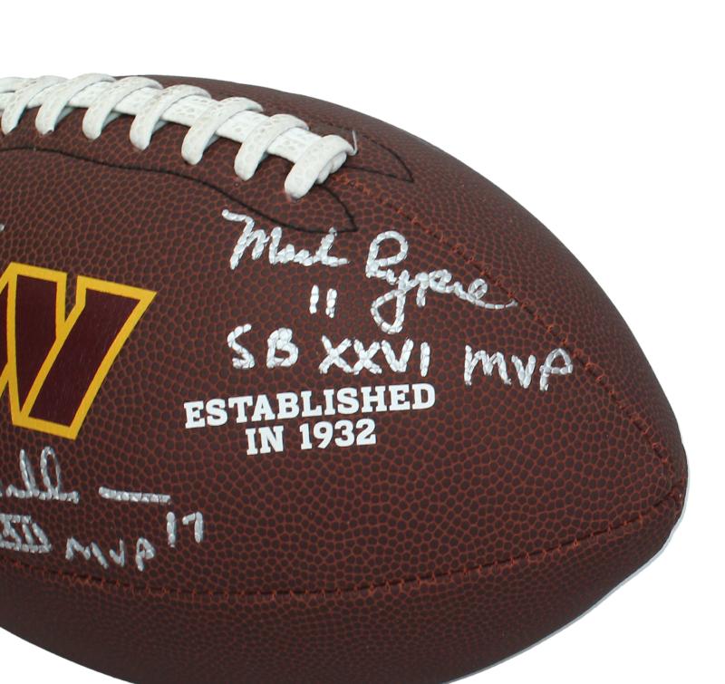 Washington Commanders logo football has been hand-signed and inscribed by Joe Theisman, Doug Williams and Mark Rypien.