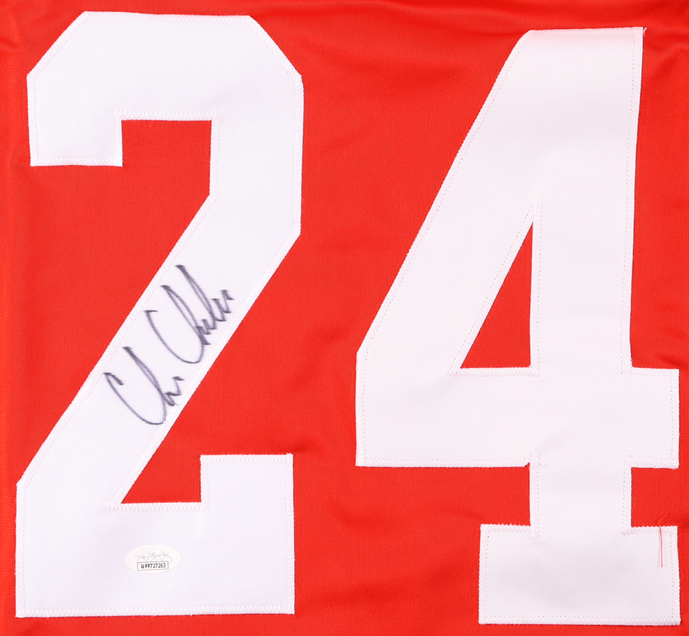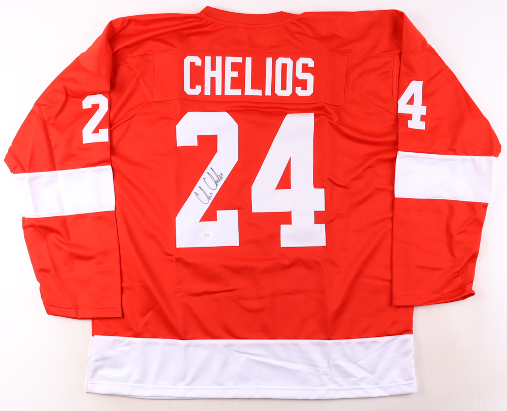 Custom Jersey, everything sewn on, size XL has been hand-signed by Chris Chelios (HOF). Please note, the signature has bled.