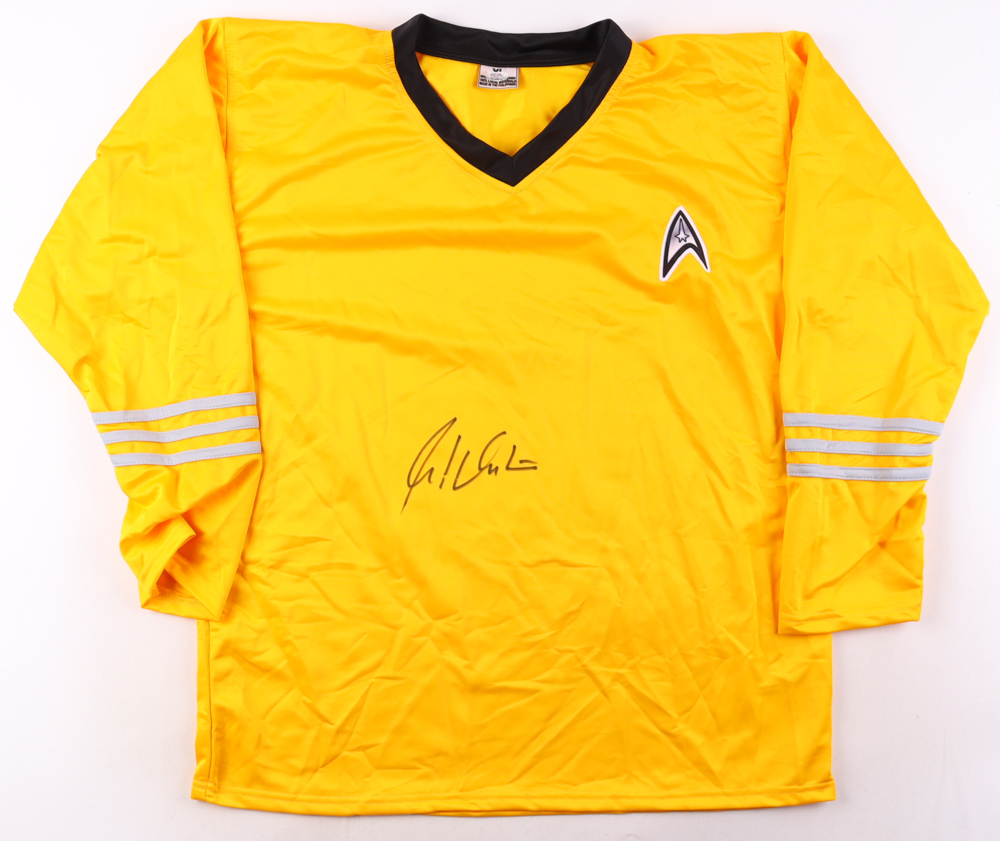 Custom Star Trek uniform shirt. Everything sewn on, size XL. Hand-signed by William Shatner.