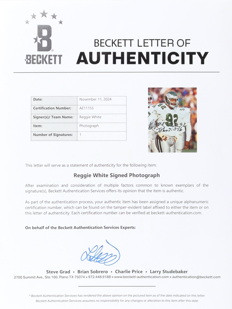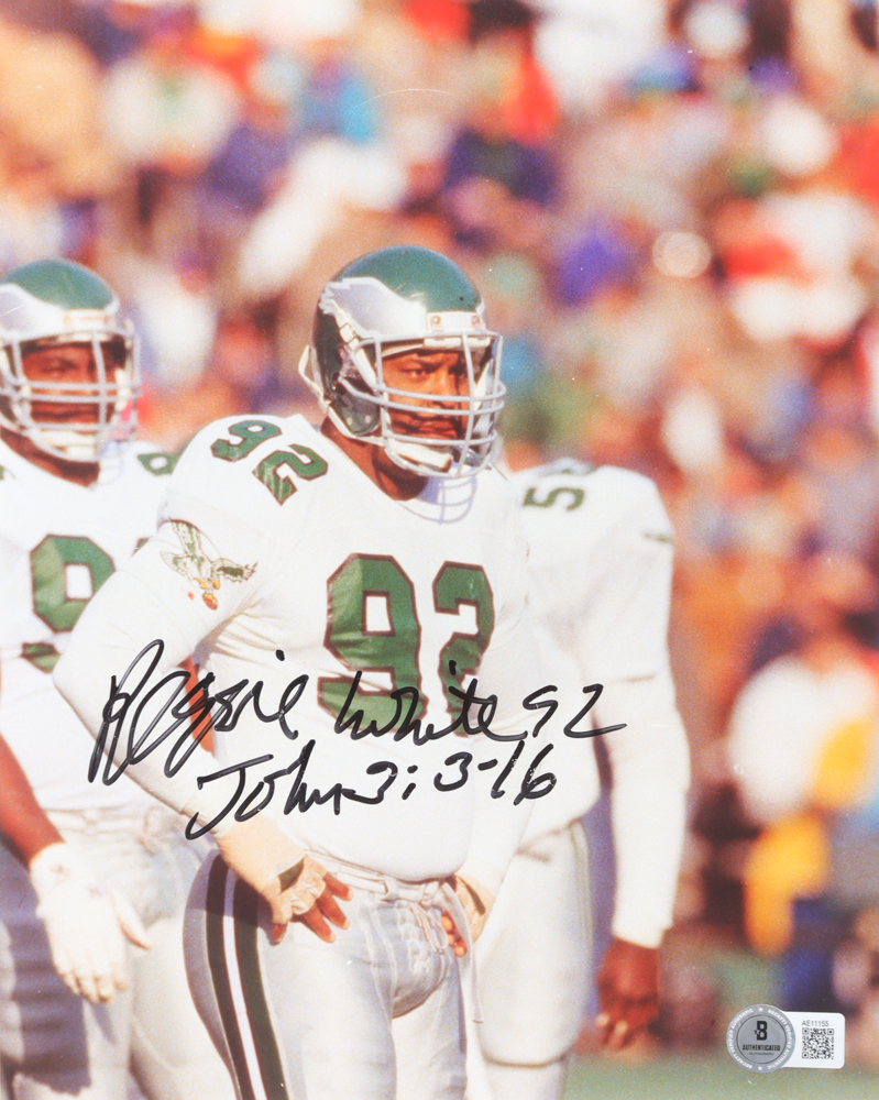 Photo measures 8" x 10" in size. Hand-signed by Reggie White (Philadelphia Eagles, HOF).