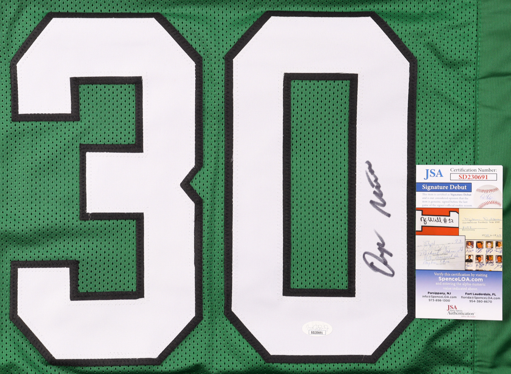 The autograph(s) includes an official James Spence Authentication (JSA) "Signature Debut" hologram and COA. "Signature Debut" is the autographed memorabilia equivalent to a rookie card. The JSA definition of a "Signature Debut" is as follows: "Any item that is autographed and received by JSA prior to the last game of the signer's official rookie season.