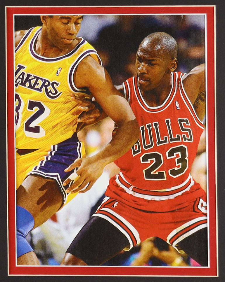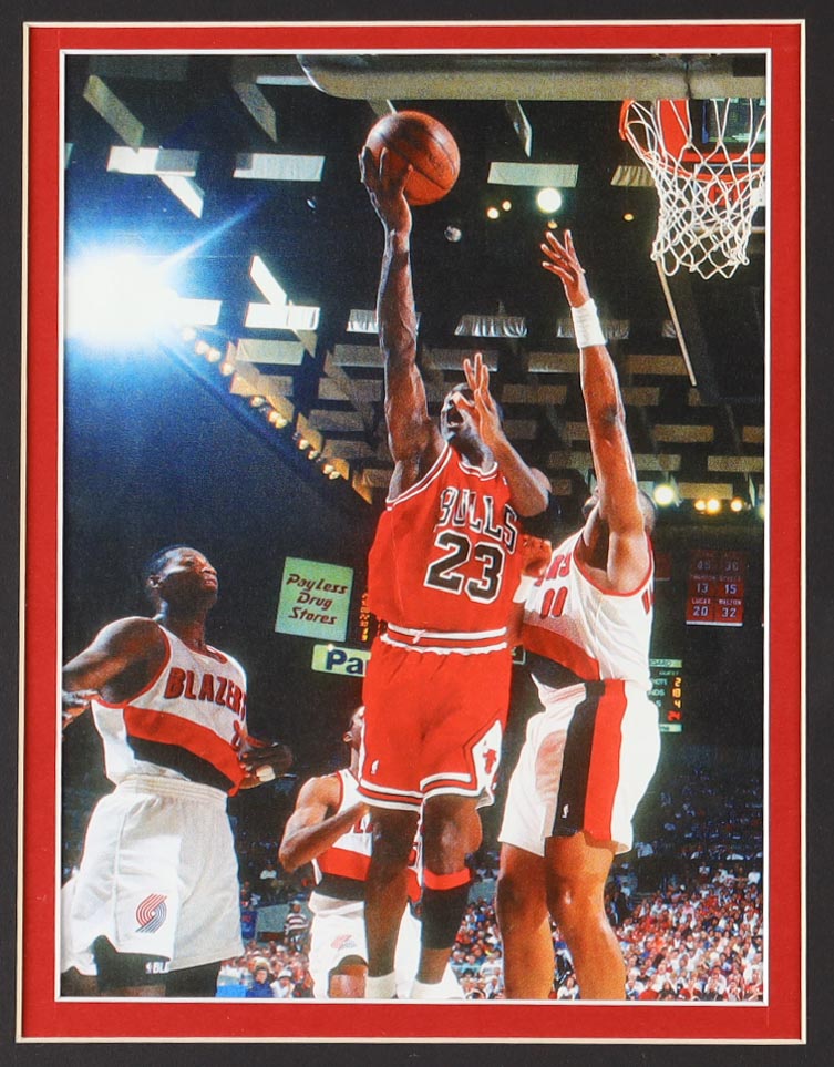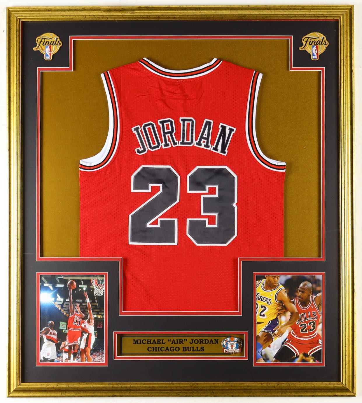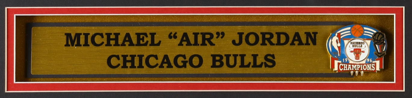 Custom frame measures approximately 33" x 37" in size and features an unsigned Michael Jordan (HOF) jersey. Also included are 1996 NBA Championship pin and (2) cloth NBA finals patches. Please note, the display is unsigned.
