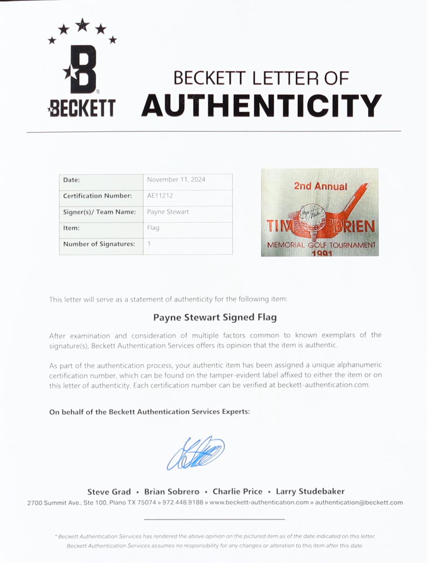 Golf flag measures 12" x 18" has been hand-signed by Payne Stewart (D. 1999, HOF). Please note there is stains all over the flag.