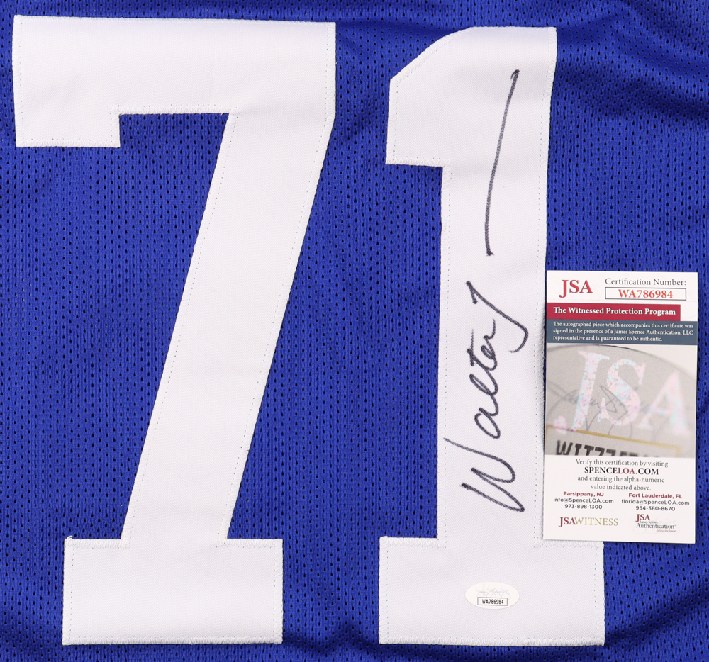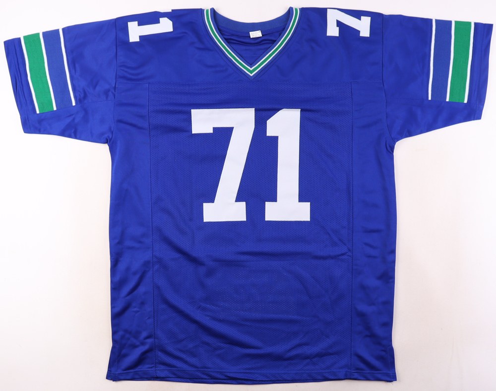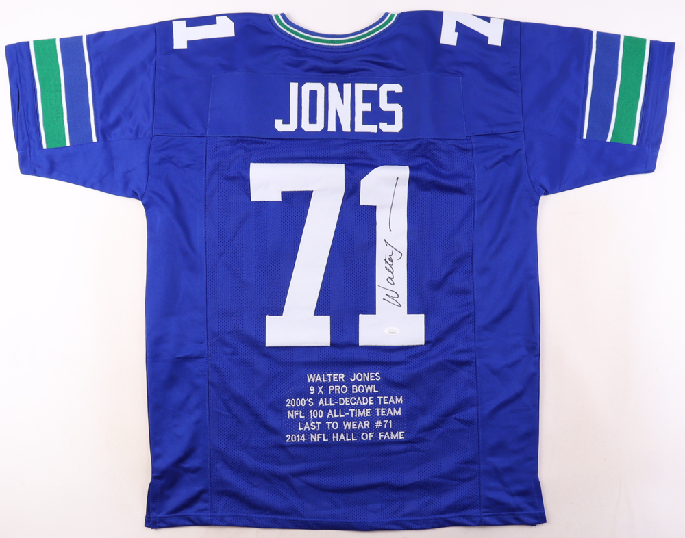 Custom jersey. Everything is sewn on, size XL. Hand-signed by Walter Jones (HOF). Jones' career highlights have been custom stitched onto the back of the jersey below the reverse numbers.