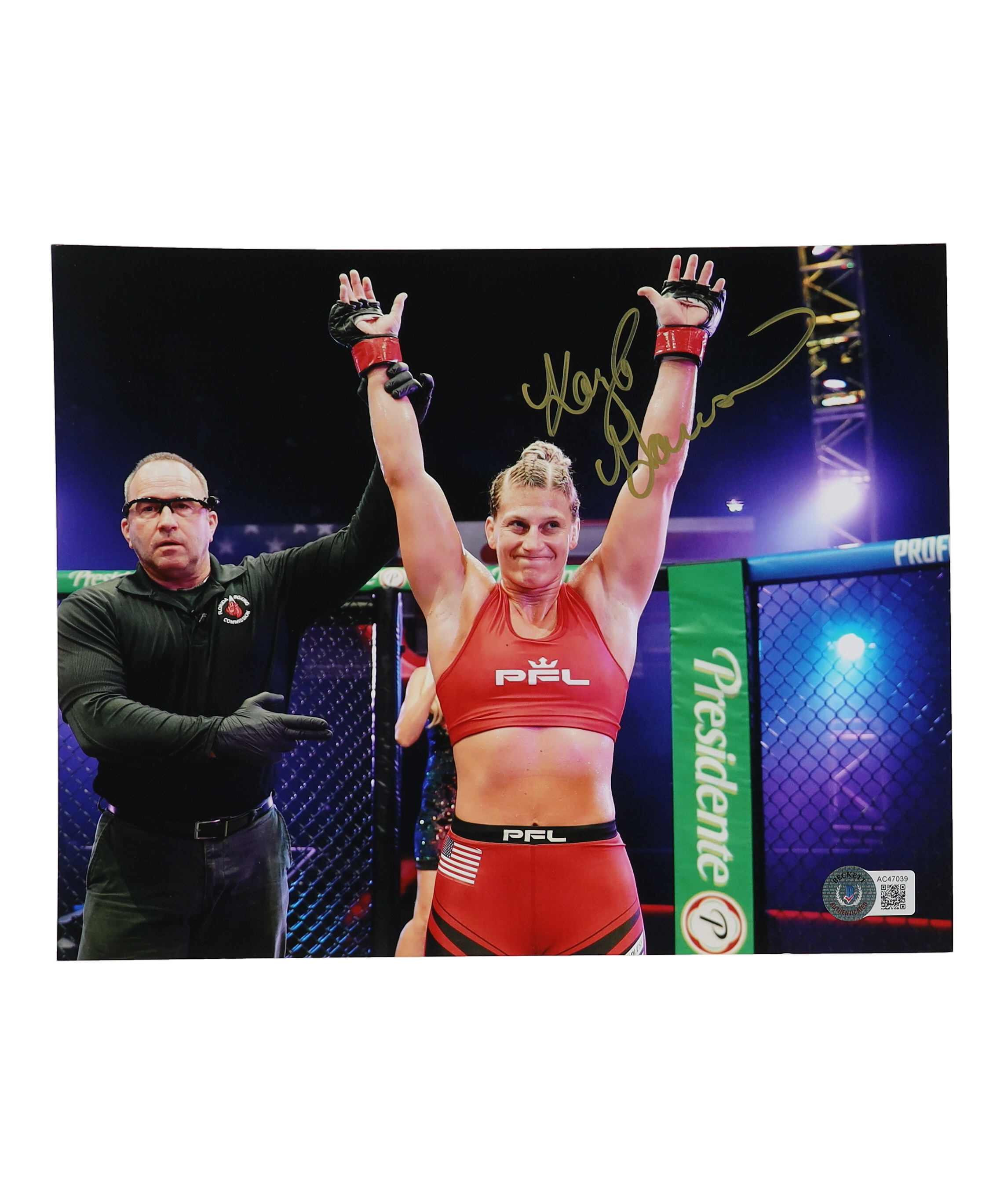 Photo measures 8" x 10" in size. Hand-signed by Kayla Harrison (HOF).