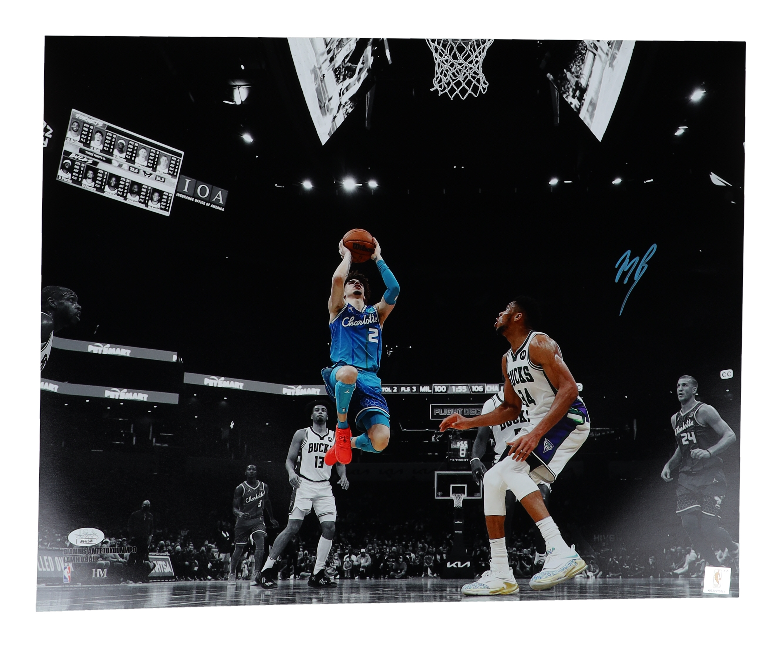 Photo measures 16" x 20" in size and has been hand-signed by LaMelo Ball (Charlotte Hornets).