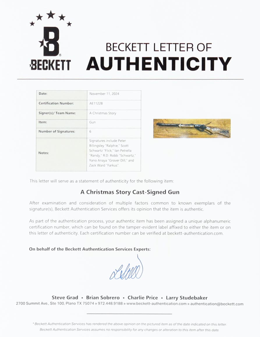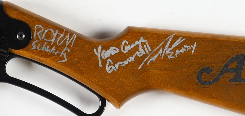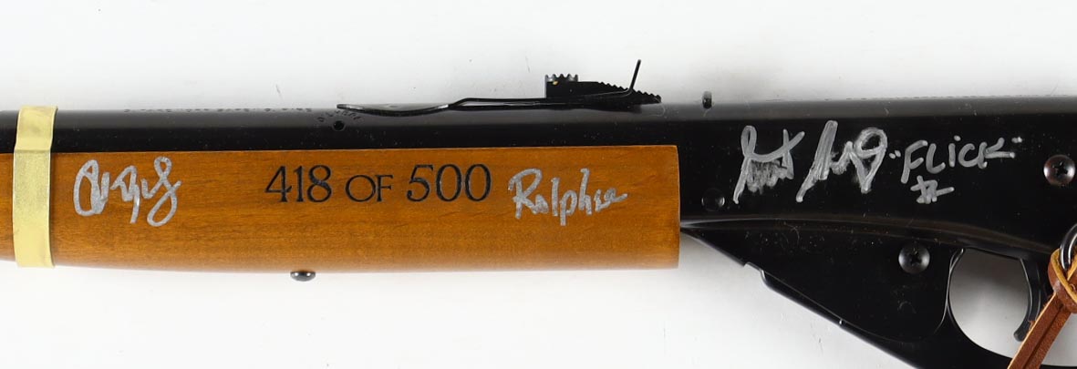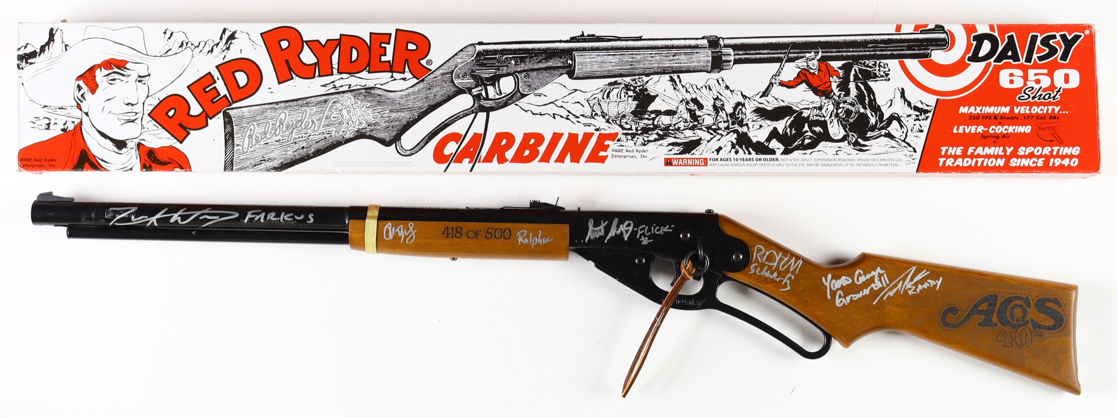 Daisy 650 Shot Red Ryder Carbine BB gun. Hand-signed and inscribed by (6) with Peter Billingsley (Ralphie), Zack Ward (Farkus), Scott Schwartz (Flick), R.D. Robb (Schwartz), Ian Petrella (Randy), and Yano Anaya (Grover Dill). The BB gun is limited edition and numbered #418/500. Please see photos for details on condition of the item and signatures.