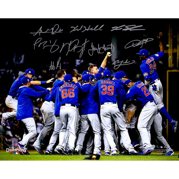 2016 Cubs World Series Champions 16x20 Photo Team-Signed by (9) with Kris Bryant, Anthony Rizzo, Jake Arrieta, Kyle Hendricks, Javier Baez, Dexter Fowler, Kyle Schwarber (MLB Hologram & Fanatics Hologram)