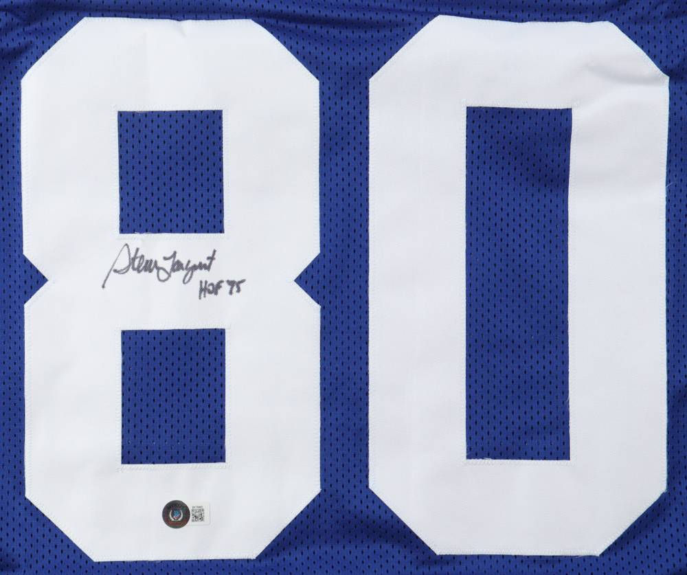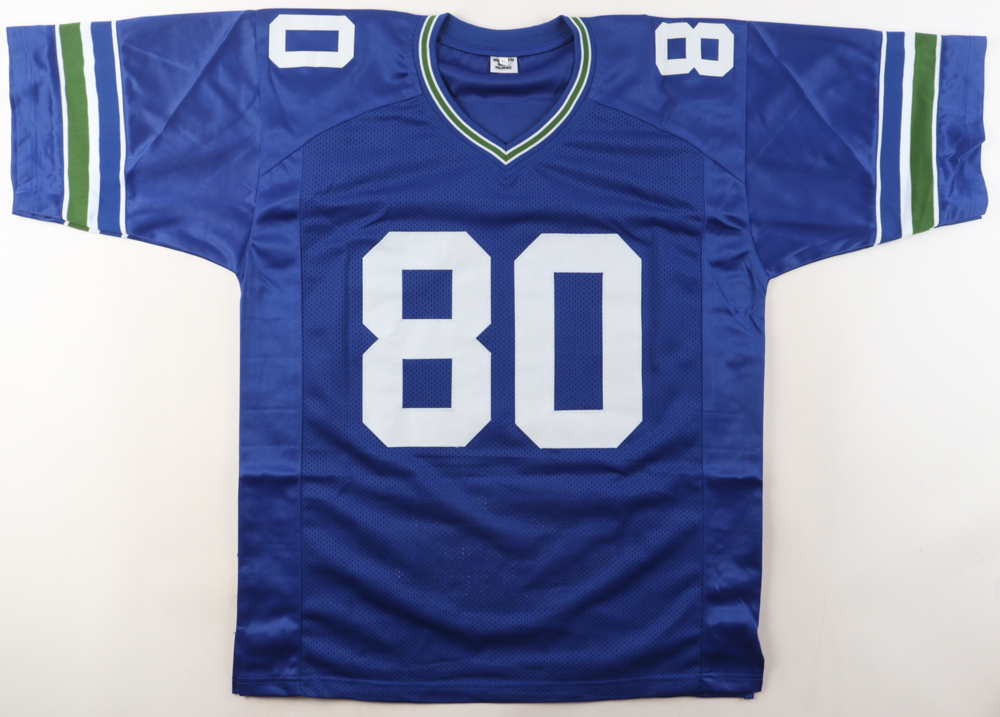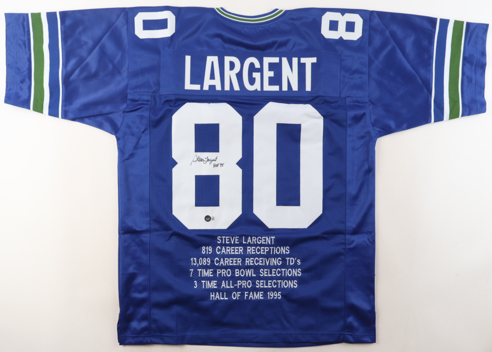 Custom jersey with everything sewn on, size XL. Hand-signed and inscribed by Steve Largent (HOF). Largent's career stats are stitched on below the reverse side numbers.