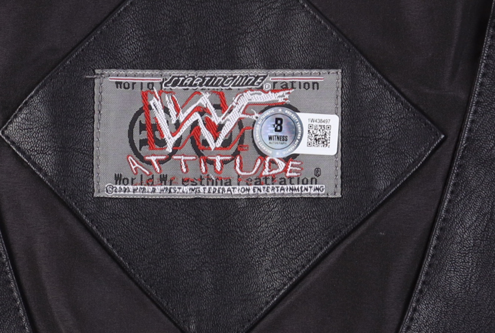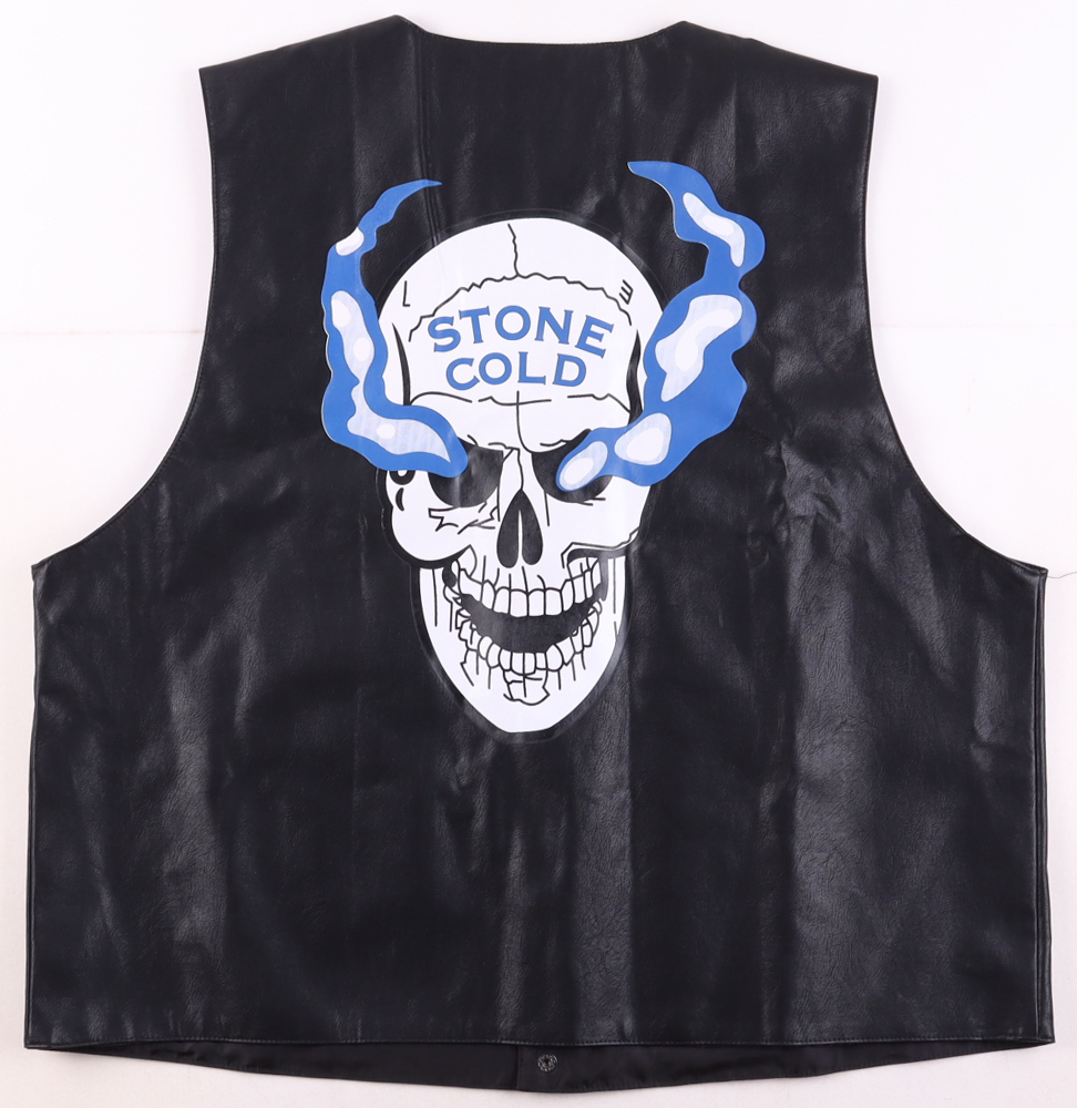 WWE leather vest with everything sewn on, size XL. Hand-signed by "Stone Cold" Steve Austin (HOF).