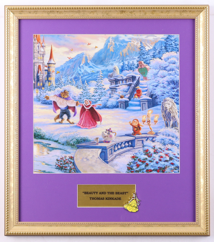Custom frame measures approximately 16" x 18" in size. The display features an unsigned Thomas Kinkade (D. 2012) art print and also includes a Belle character Pin. Please note, the item is unsigned.