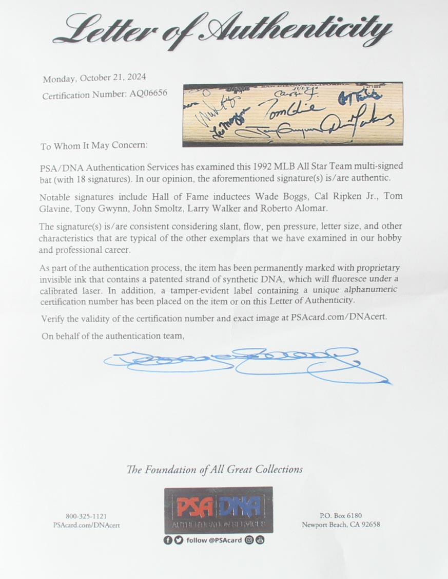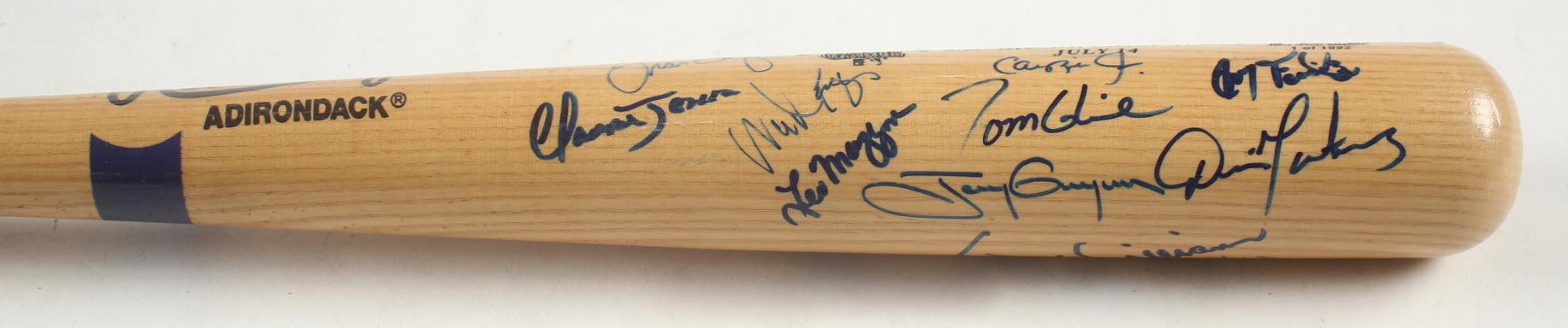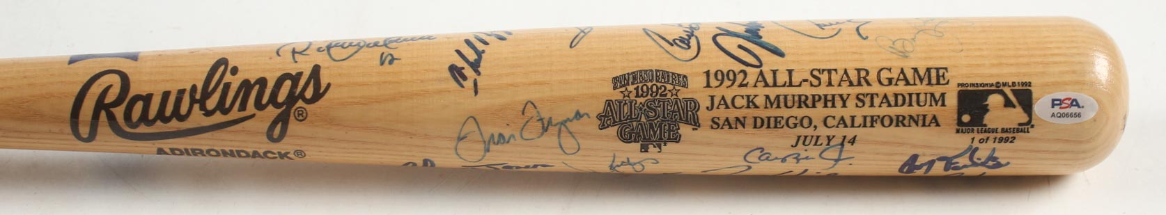 Rawlings Adirondack 1992 All-Star Game baseball bat. Hand-signed by (18) with Tony Gwynn, Cal Ripken Jr., Roberto Alomar, Wade Boggs, Tom Glavine, John Smoltz, Larry Walker, Sandy Alomar Jr., Brady Anderson, Carlos Baerga, Tony Fernandez, Travis Fryman, Clarence Jones, Dennis Martinez, Leo Mazzone, Charles Nagy, Benito Santiago, and Jimmy Williams. Please note, some of the autographs are scuffed, smudged and faded.
