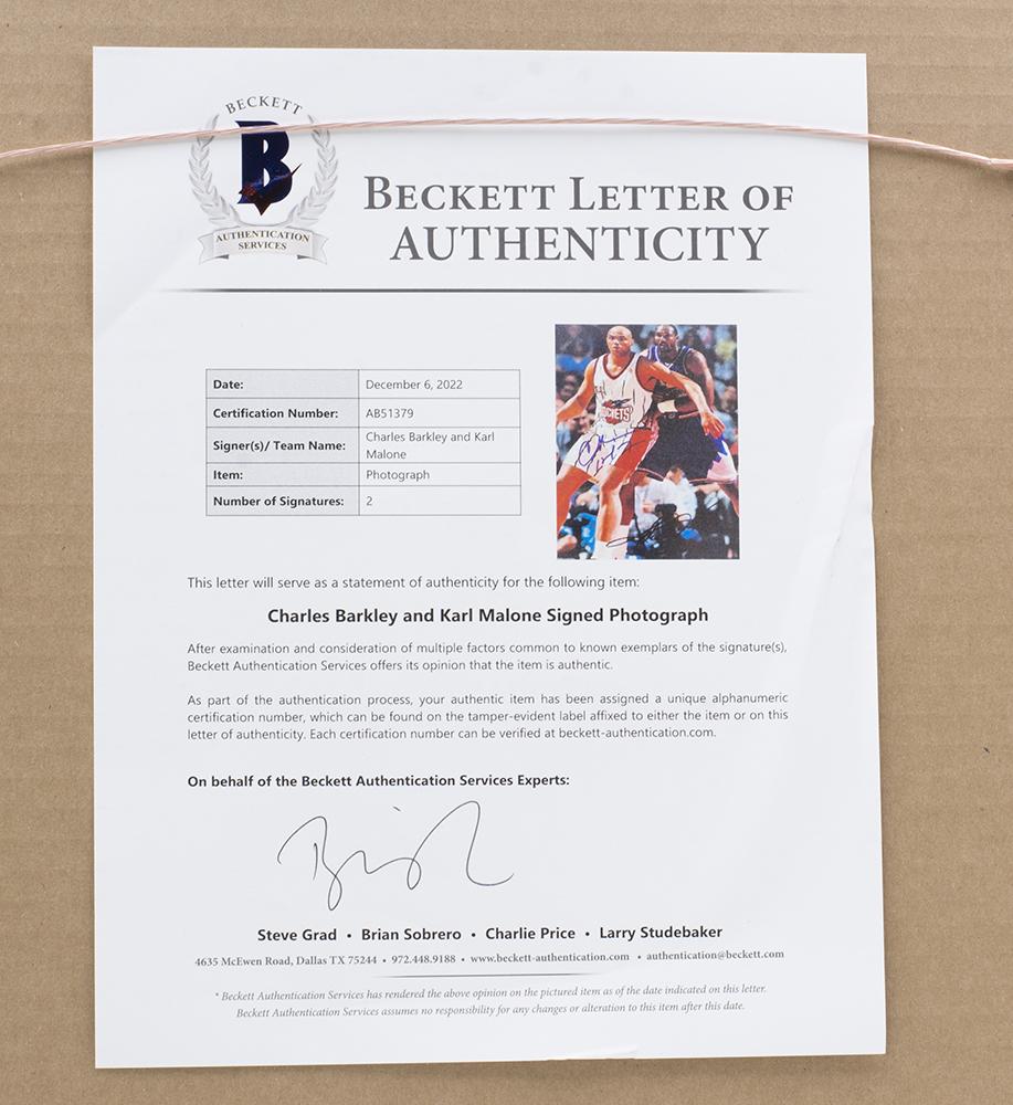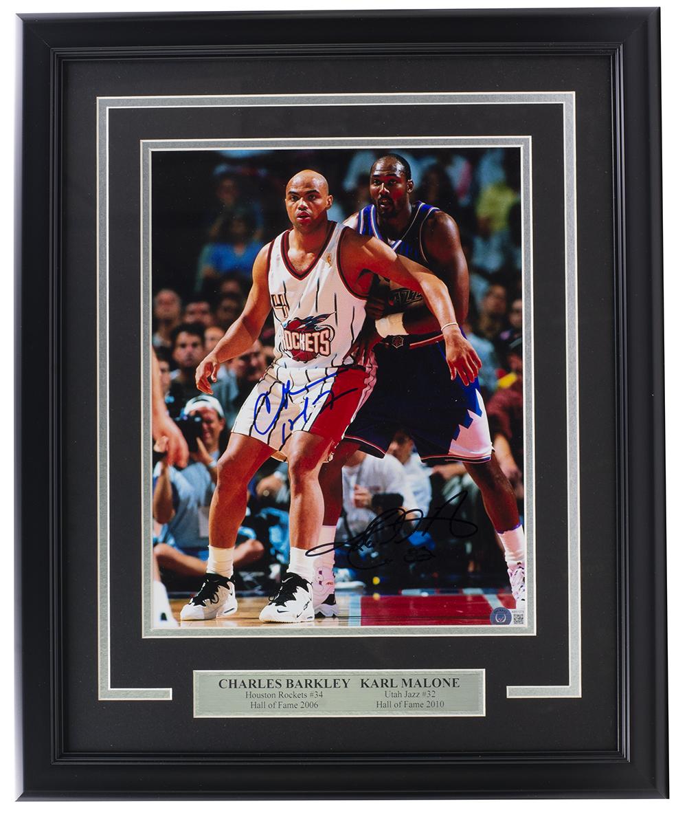 Custom frame measures 16” x 20” in size and features a photo that has been hand-signed by Charles Barkley (Houston Rockets, HOF) and Karl Malone (Utah Jazz, HOF).