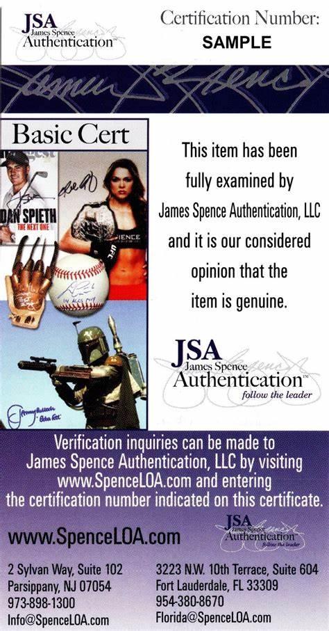 The autograph(s) includes an official James Spence Authentication (JSA) "Signature Debut" hologram and COA. "Signature Debut" is the autographed memorabilia equivalent to a rookie card. The JSA definition of a "Signature Debut" is as follows: "Any item that is autographed and received by JSA prior to the last game of the signer's official rookie season.
